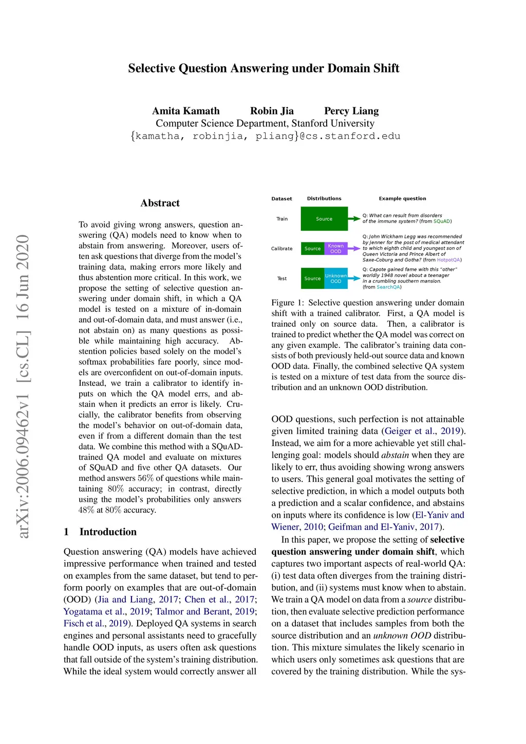 To avoid giving wrong answers, question answering (QA) models need to know when to abstain from answering. Moreover, users often ask questions that diverge from the model's training data, making errors more likely and thus abstention more critical. In this work, we propose the setting of selective question answering under domain shift, in which a QA model is tested on a mixture of in-domain and out-of-domain data, and must answer (i.e., not abstain on) as many questions as possible while maintaining high accuracy. Abstention policies based solely on the model's softmax probabilities fare poorly, since models are overconfident on out-of-domain inputs. Instead, we train a calibrator to identify inputs on which the QA model errs, and abstain when it predicts an error is likely. Crucially, the calibrator benefits from observing the model's behavior on out-of-domain data, even if from a different domain than the test data. We combine this method with a SQuAD-trained QA model and evaluate on mixtures of SQuAD and five other QA datasets. Our method answers 56% of questions while maintaining 80% accuracy; in contrast, directly using the model's probabilities only answers 48% at 80% accuracy.