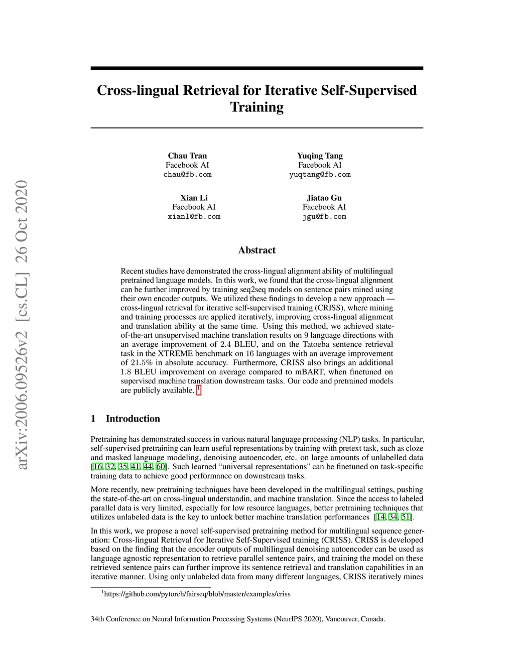Recent studies have demonstrated the cross-lingual alignment ability of multilingual pretrained language models. In this work, we found that the cross-lingual alignment can be further improved by training seq2seq models on sentence pairs mined using their own encoder outputs. We utilized these findings to develop a new approach -- cross-lingual retrieval for iterative self-supervised training (CRISS), where mining and training processes are applied iteratively, improving cross-lingual alignment and translation ability at the same time. Using this method, we achieved state-of-the-art unsupervised machine translation results on 9 language directions with an average improvement of 2.4 BLEU, and on the Tatoeba sentence retrieval task in the XTREME benchmark on 16 languages with an average improvement of 21.5% in absolute accuracy. Furthermore, CRISS also brings an additional 1.8 BLEU improvement on average compared to mBART, when finetuned on supervised machine translation downstream tasks.