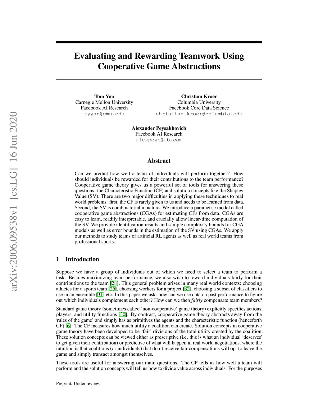 Can we predict how well a team of individuals will perform together? How should individuals be rewarded for their contributions to the team performance? Cooperative game theory gives us a powerful set of tools for answering these questions: the Characteristic Function (CF) and solution concepts like the Shapley Value (SV). There are two major difficulties in applying these techniques to real world problems: first, the CF is rarely given to us and needs to be learned from data. Second, the SV is combinatorial in nature. We introduce a parametric model called cooperative game abstractions (CGAs) for estimating CFs from data. CGAs are easy to learn, readily interpretable, and crucially allow linear-time computation of the SV. We provide identification results and sample complexity bounds for CGA models as well as error bounds in the estimation of the SV using CGAs. We apply our methods to study teams of artificial RL agents as well as real world teams from professional sports.