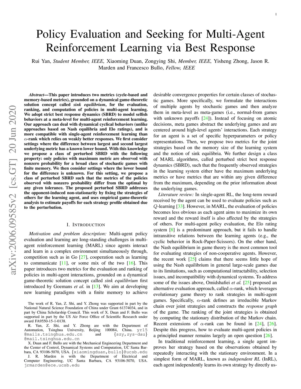 This paper introduces two metrics (cycle-based and memory-based metrics), grounded on a dynamical game-theoretic solution concept called sink equilibrium, for the evaluation, ranking, and computation of policies in multi-agent learning. We adopt strict best response dynamics (SBRD) to model selfish behaviors at a meta-level for multi-agent reinforcement learning. Our approach can deal with dynamical cyclical behaviors (unlike approaches based on Nash equilibria and Elo ratings), and is more compatible with single-agent reinforcement learning than alpha-rank which relies on weakly better responses. We first consider settings where the difference between largest and second largest underlying metric has a known lower bound. With this knowledge we propose a class of perturbed SBRD with the following property: only policies with maximum metric are observed with nonzero probability for a broad class of stochastic games with finite memory. We then consider settings where the lower bound for the difference is unknown. For this setting, we propose a class of perturbed SBRD such that the metrics of the policies observed with nonzero probability differ from the optimal by any given tolerance. The proposed perturbed SBRD addresses the opponent-induced non-stationarity by fixing the strategies of others for the learning agent, and uses empirical game-theoretic analysis to estimate payoffs for each strategy profile obtained due to the perturbation.