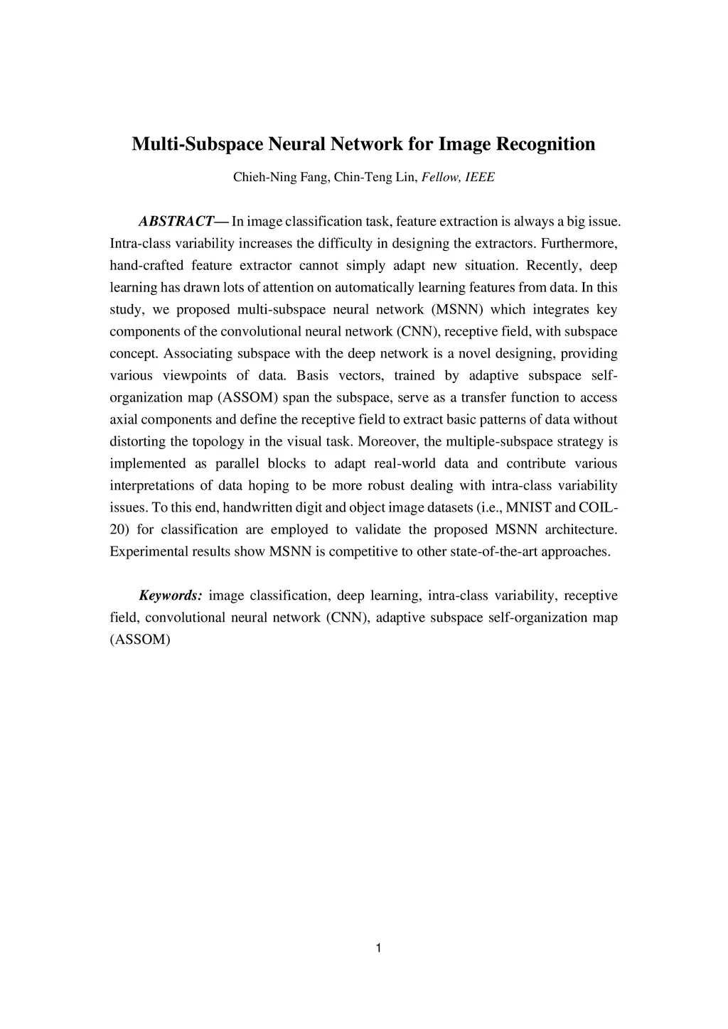 In image classification task, feature extraction is always a big issue. Intra-class variability increases the difficulty in designing the extractors. Furthermore, hand-crafted feature extractor cannot simply adapt new situation. Recently, deep learning has drawn lots of attention on automatically learning features from data. In this study, we proposed multi-subspace neural network (MSNN) which integrates key components of the convolutional neural network (CNN), receptive field, with subspace concept. Associating subspace with the deep network is a novel designing, providing various viewpoints of data. Basis vectors, trained by adaptive subspace self-organization map (ASSOM) span the subspace, serve as a transfer function to access axial components and define the receptive field to extract basic patterns of data without distorting the topology in the visual task. Moreover, the multiple-subspace strategy is implemented as parallel blocks to adapt real-world data and contribute various interpretations of data hoping to be more robust dealing with intra-class variability issues. To this end, handwritten digit and object image datasets (i.e., MNIST and COIL-20) for classification are employed to validate the proposed MSNN architecture. Experimental results show MSNN is competitive to other state-of-the-art approaches.