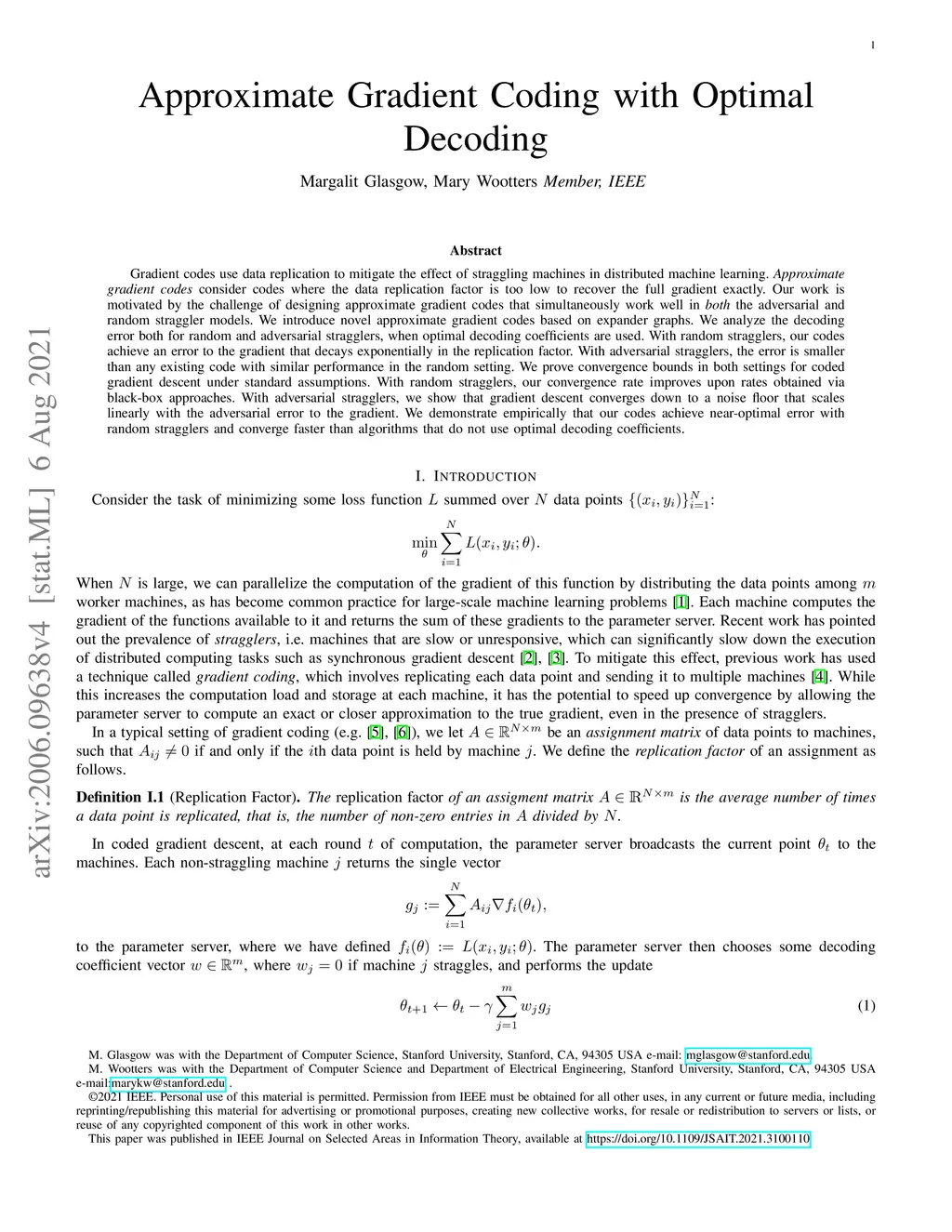 In distributed optimization problems, a technique called gradient coding, which involves replicating data points, has been used to mitigate the effect of straggling machines. Recent work has studied approximate gradient coding, which concerns coding schemes where the replication factor of the data is too low to recover the full gradient exactly. Our work is motivated by the challenge of creating approximate gradient coding schemes that simultaneously work well in both the adversarial and stochastic models. To that end, we introduce novel approximate gradient codes based on expander graphs, in which each machine receives exactly two blocks of data points. We analyze the decoding error both in the random and adversarial straggler setting, when optimal decoding coefficients are used. We show that in the random setting, our schemes achieve an error to the gradient that decays exponentially in the replication factor. In the adversarial setting, the error is nearly a factor of two smaller than any existing code with similar performance in the random setting. We show convergence bounds both in the random and adversarial setting for gradient descent under standard assumptions using our codes. In the random setting, our convergence rate improves upon block-box bounds. In the adversarial setting, we show that gradient descent can converge down to a noise floor that scales linearly with the adversarial error to the gradient. We demonstrate empirically that our schemes achieve near-optimal error in the random setting and converge faster than algorithms which do not use the optimal decoding coefficients.