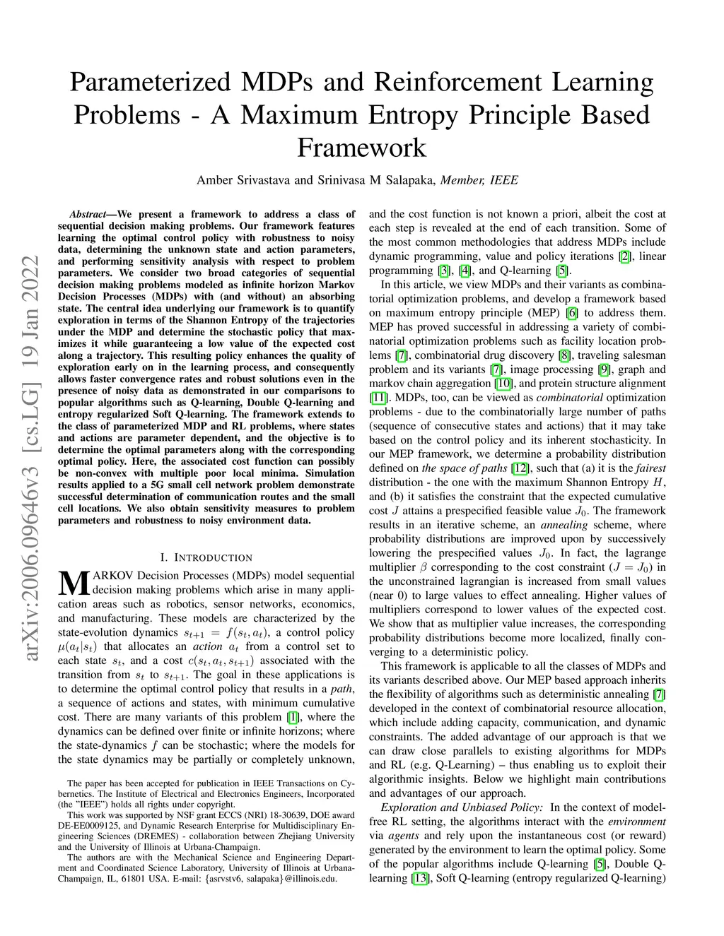 We present a framework to address a class of sequential decision making problems. Our framework features learning the optimal control policy with robustness to noisy data, determining the unknown state and action parameters, and performing sensitivity analysis with respect to problem parameters. We consider two broad categories of sequential decision making problems modelled as infinite horizon Markov Decision Processes (MDPs) with (and without) an absorbing state. The central idea underlying our framework is to quantify exploration in terms of the Shannon Entropy of the trajectories under the MDP and determine the stochastic policy that maximizes it while guaranteeing a low value of the expected cost along a trajectory. This resulting policy enhances the quality of exploration early on in the learning process, and consequently allows faster convergence rates and robust solutions even in the presence of noisy data as demonstrated in our comparisons to popular algorithms such as Q-learning, Double Q-learning and entropy regularized Soft Q-learning. The framework extends to the class of parameterized MDP and RL problems, where states and actions are parameter dependent, and the objective is to determine the optimal parameters along with the corresponding optimal policy. Here, the associated cost function can possibly be non-convex with multiple poor local minima. Simulation results applied to a 5G small cell network problem demonstrate successful determination of communication routes and the small cell locations. We also obtain sensitivity measures to problem parameters and robustness to noisy environment data.