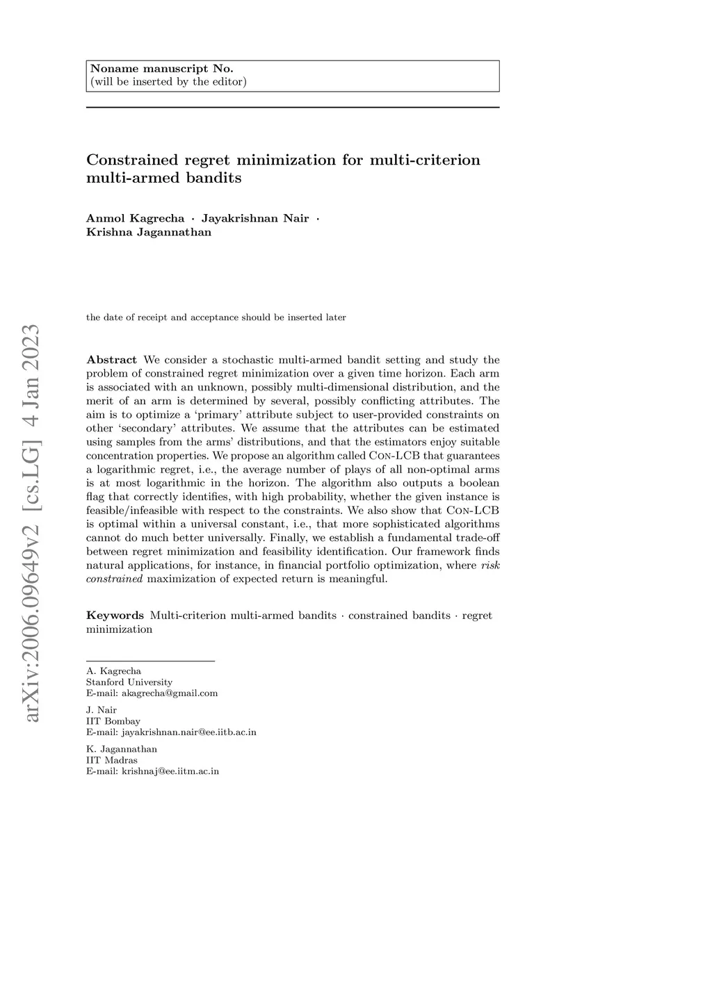 We consider a stochastic multi-armed bandit setting and study the problem of constrained regret minimization over a given time horizon. Each arm is associated with an unknown, possibly multi-dimensional distribution, and the merit of an arm is determined by several, possibly conflicting attributes. The aim is to optimize a 'primary' attribute subject to user-provided constraints on other 'secondary' attributes. We assume that the attributes can be estimated using samples from the arms' distributions, and that the estimators enjoy suitable concentration properties. We propose an algorithm called Con-LCB that guarantees a logarithmic regret, i.e., the average number of plays of all non-optimal arms is at most logarithmic in the horizon. The algorithm also outputs a Boolean flag that correctly identifies, with high probability, whether the given instance is feasible/infeasible with respect to the constraints. We also show that Con-LCB is optimal within a universal constant, i.e., that more sophisticated algorithms cannot do much better universally. Finally, we establish a fundamental trade-off between regret minimization and feasibility identification. Our framework finds natural applications, for instance, in financial portfolio optimization, where risk constrained maximization of expected return is meaningful.