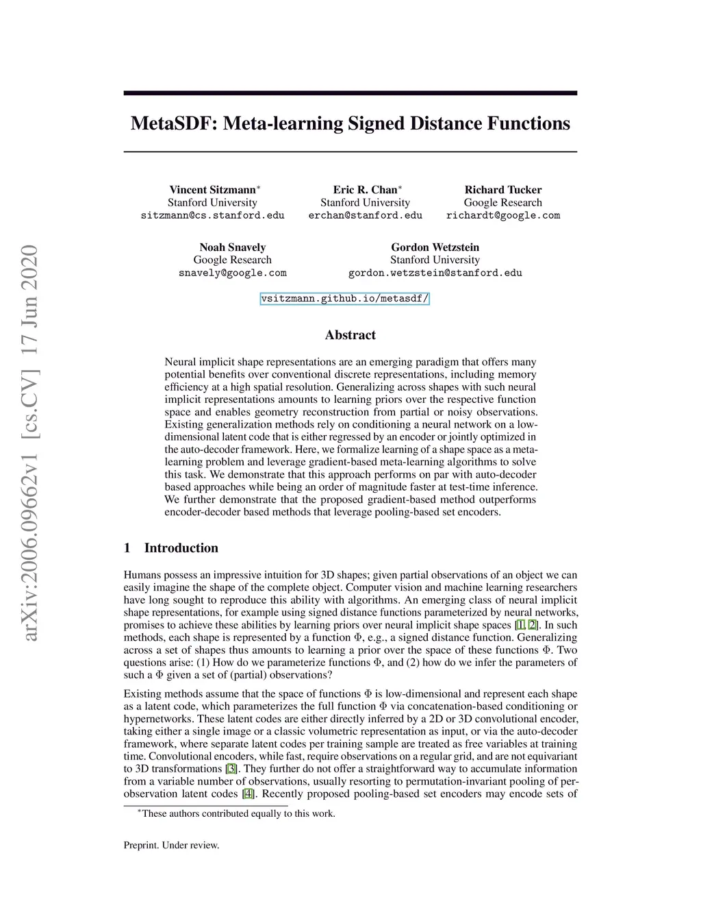 Neural implicit shape representations are an emerging paradigm that offers many potential benefits over conventional discrete representations, including memory efficiency at a high spatial resolution. Generalizing across shapes with such neural implicit representations amounts to learning priors over the respective function space and enables geometry reconstruction from partial or noisy observations. Existing generalization methods rely on conditioning a neural network on a low-dimensional latent code that is either regressed by an encoder or jointly optimized in the auto-decoder framework. Here, we formalize learning of a shape space as a meta-learning problem and leverage gradient-based meta-learning algorithms to solve this task. We demonstrate that this approach performs on par with auto-decoder based approaches while being an order of magnitude faster at test-time inference. We further demonstrate that the proposed gradient-based method outperforms encoder-decoder based methods that leverage pooling-based set encoders.