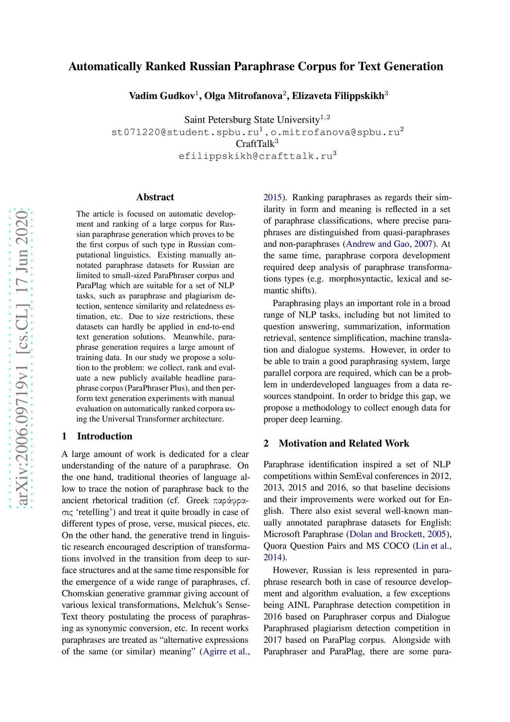 Automatically Ranked Russian Paraphrase Corpus for Text Generation