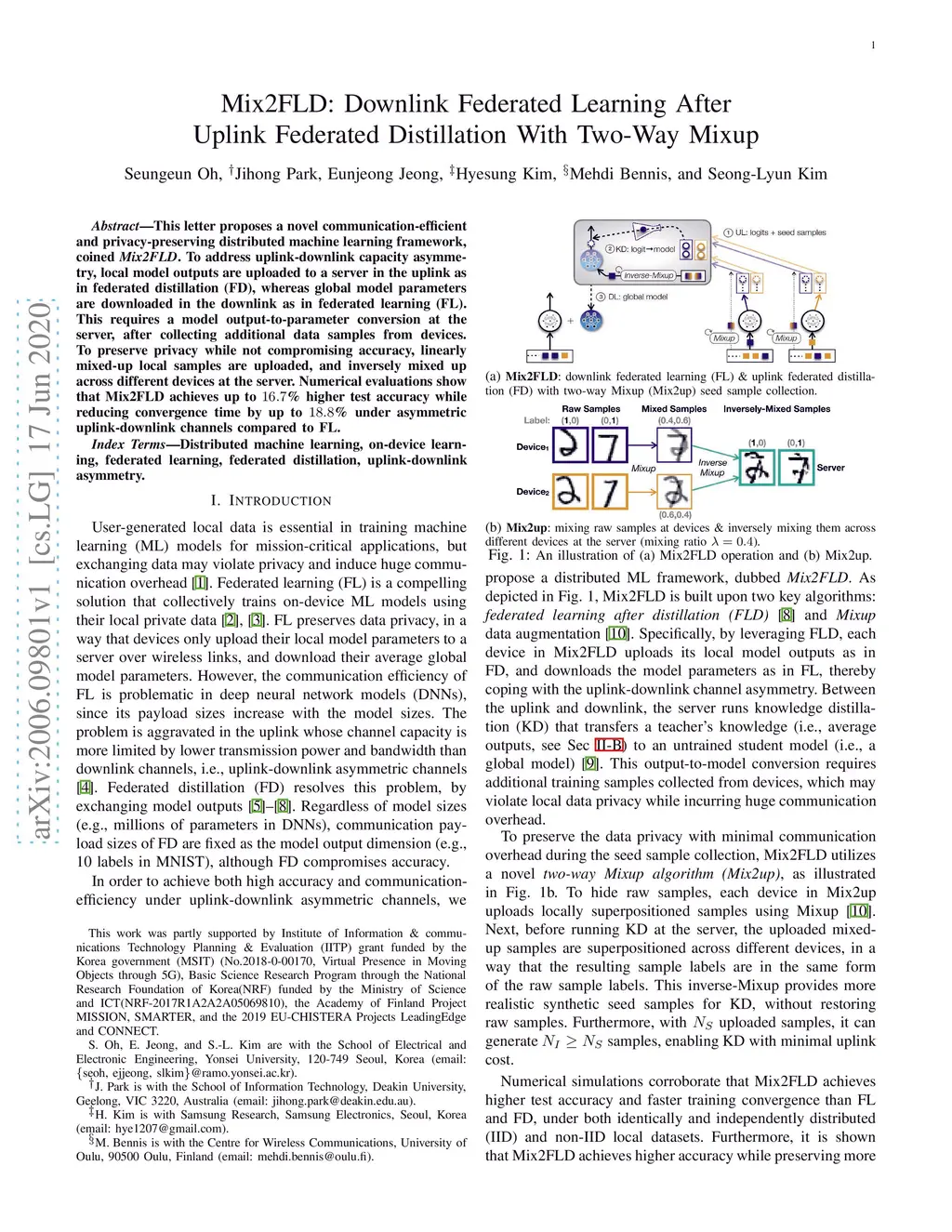 This letter proposes a novel communication-efficient and privacy-preserving distributed machine learning framework, coined Mix2FLD. To address uplink-downlink capacity asymmetry, local model outputs are uploaded to a server in the uplink as in federated distillation (FD), whereas global model parameters are downloaded in the downlink as in federated learning (FL). This requires a model output-to-parameter conversion at the server, after collecting additional data samples from devices. To preserve privacy while not compromising accuracy, linearly mixed-up local samples are uploaded, and inversely mixed up across different devices at the server. Numerical evaluations show that Mix2FLD achieves up to 16.7% higher test accuracy while reducing convergence time by up to 18.8% under asymmetric uplink-downlink channels compared to FL.
