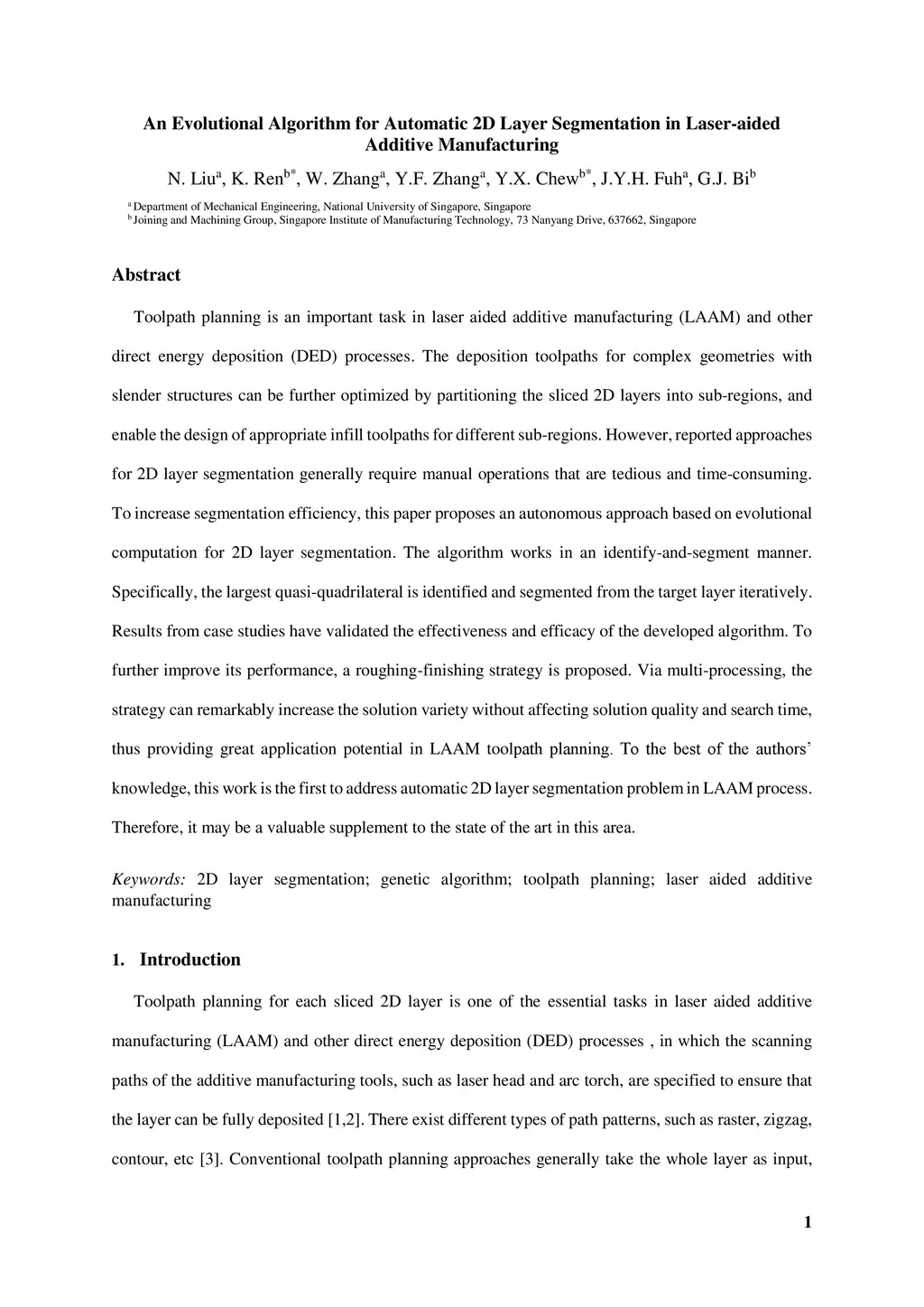 Toolpath planning is an important task in laser aided additive manufacturing (LAAM) and other direct energy deposition (DED) processes. The deposition toolpaths for complex geometries with slender structures can be further optimized by partitioning the sliced 2D layers into sub-regions, and enable the design of appropriate infill toolpaths for different sub-regions. However, reported approaches for 2D layer segmentation generally require manual operations that are tedious and time-consuming. To increase segmentation efficiency, this paper proposes an autonomous approach based on evolutional computation for 2D layer segmentation. The algorithm works in an identify-and-segment manner. Specifically, the largest quasi-quadrilateral is identified and segmented from the target layer iteratively. Results from case studies have validated the effectiveness and efficacy of the developed algorithm. To further improve its performance, a roughing-finishing strategy is proposed. Via multi-processing, the strategy can remarkably increase the solution variety without affecting solution quality and search time, thus providing great application potential in LAAM toolpath planning. To the best of the authors knowledge, this work is the first to address automatic 2D layer segmentation problem in LAAM process. Therefore, it may be a valuable supplement to the state of the art in this area.