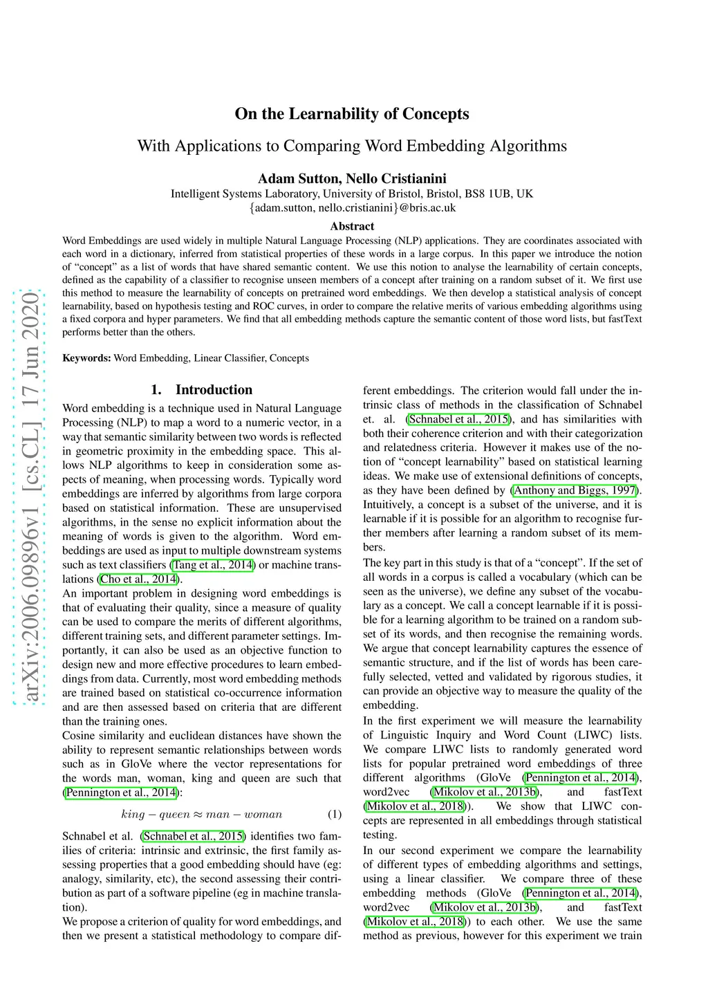 Word Embeddings are used widely in multiple Natural Language Processing (NLP) applications. They are coordinates associated with each word in a dictionary, inferred from statistical properties of these words in a large corpus. In this paper we introduce the notion of "concept" as a list of words that have shared semantic content. We use this notion to analyse the learnability of certain concepts, defined as the capability of a classifier to recognise unseen members of a concept after training on a random subset of it. We first use this method to measure the learnability of concepts on pretrained word embeddings. We then develop a statistical analysis of concept learnability, based on hypothesis testing and ROC curves, in order to compare the relative merits of various embedding algorithms using a fixed corpora and hyper parameters. We find that all embedding methods capture the semantic content of those word lists, but fastText performs better than the others.
