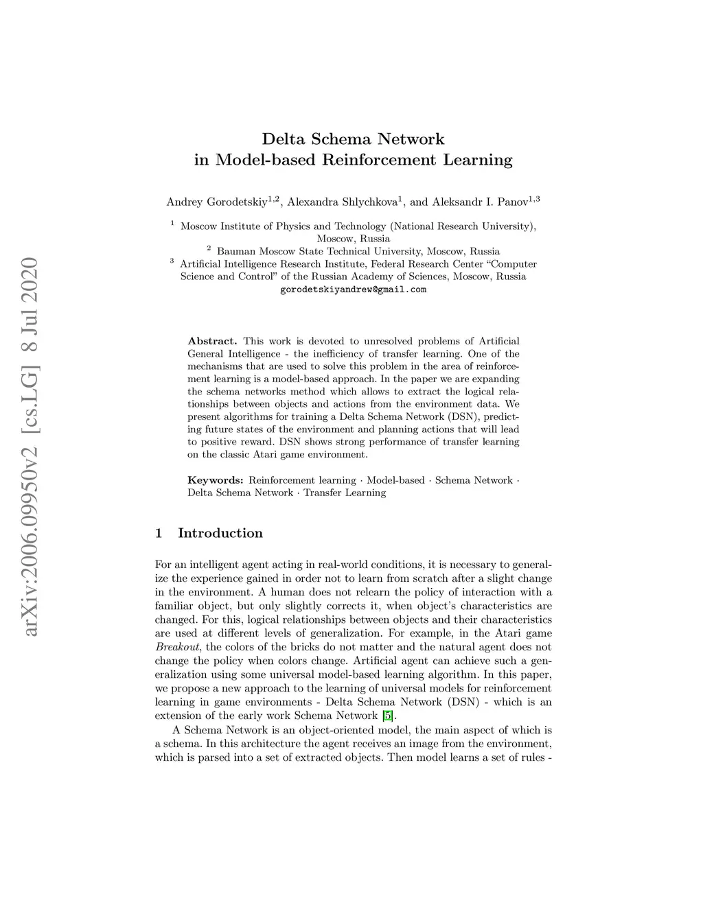 This work is devoted to unresolved problems of Artificial General Intelligence - the inefficiency of transfer learning. One of the mechanisms that are used to solve this problem in the area of reinforcement learning is a model-based approach. In the paper we are expanding the schema networks method which allows to extract the logical relationships between objects and actions from the environment data. We present algorithms for training a Delta Schema Network (DSN), predicting future states of the environment and planning actions that will lead to positive reward. DSN shows strong performance of transfer learning on the classic Atari game environment.