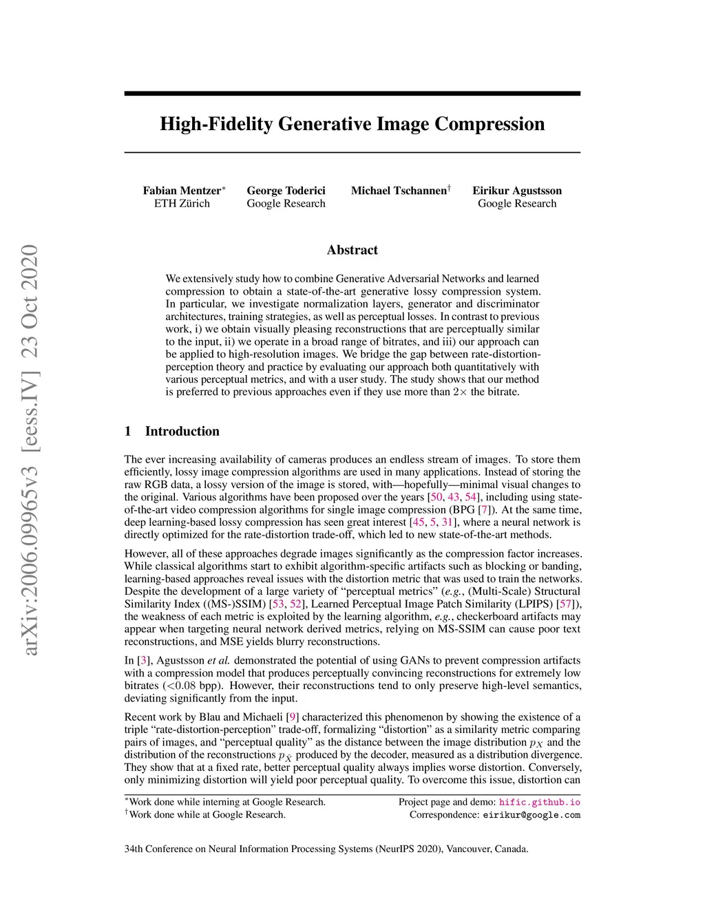 We extensively study how to combine Generative Adversarial Networks and learned compression to obtain a state-of-the-art generative lossy compression system. In particular, we investigate normalization layers, generator and discriminator architectures, training strategies, as well as perceptual losses. In contrast to previous work, i) we obtain visually pleasing reconstructions that are perceptually similar to the input, ii) we operate in a broad range of bitrates, and iii) our approach can be applied to high-resolution images. We bridge the gap between rate-distortion-perception theory and practice by evaluating our approach both quantitatively with various perceptual metrics, and with a user study. The study shows that our method is preferred to previous approaches even if they use more than 2x the bitrate.