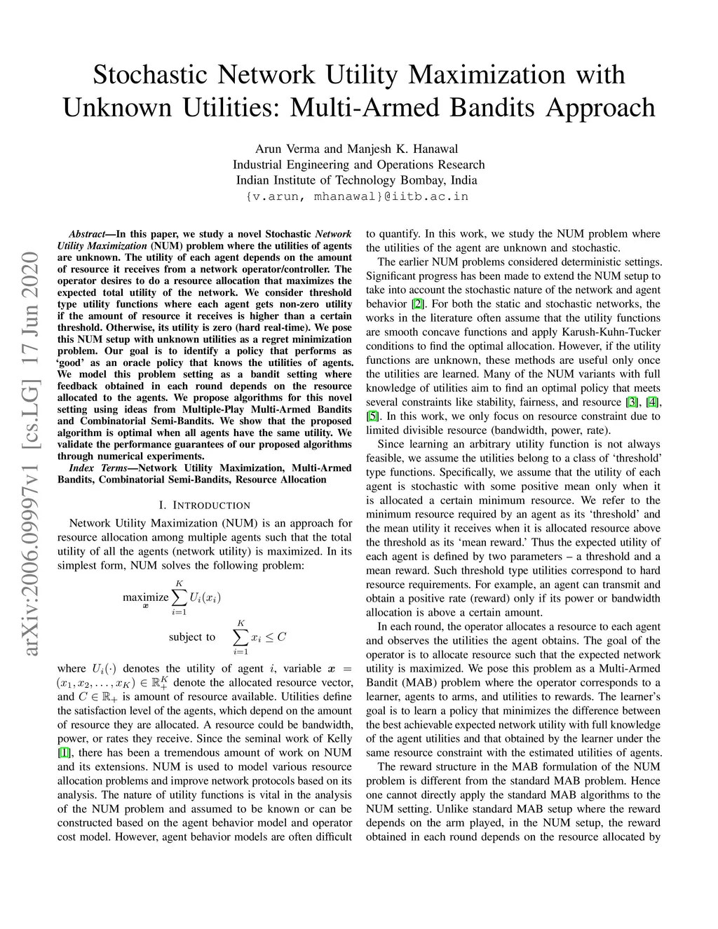 In this paper, we study a novel Stochastic Network Utility Maximization (NUM) problem where the utilities of agents are unknown. The utility of each agent depends on the amount of resource it receives from a network operator/controller. The operator desires to do a resource allocation that maximizes the expected total utility of the network. We consider threshold type utility functions where each agent gets non-zero utility if the amount of resource it receives is higher than a certain threshold. Otherwise, its utility is zero (hard real-time). We pose this NUM setup with unknown utilities as a regret minimization problem. Our goal is to identify a policy that performs as `good' as an oracle policy that knows the utilities of agents. We model this problem setting as a bandit setting where feedback obtained in each round depends on the resource allocated to the agents. We propose algorithms for this novel setting using ideas from Multiple-Play Multi-Armed Bandits and Combinatorial Semi-Bandits. We show that the proposed algorithm is optimal when all agents have the same utility. We validate the performance guarantees of our proposed algorithms through numerical experiments.