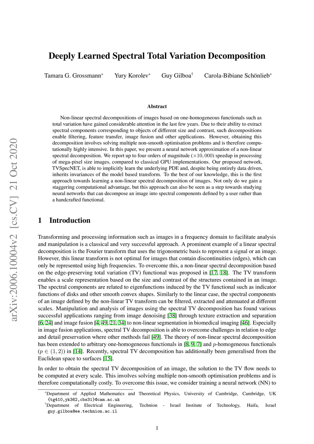 Non-linear spectral decompositions of images based on one-homogeneous functionals such as total variation have gained considerable attention in the last few years. Due to their ability to extract spectral components corresponding to objects of different size and contrast, such decompositions enable filtering, feature transfer, image fusion and other applications. However, obtaining this decomposition involves solving multiple non-smooth optimisation problems and is therefore computationally highly intensive. In this paper, we present a neural network approximation of a non-linear spectral decomposition. We report up to four orders of magnitude () speedup in processing of mega-pixel size images, compared to classical GPU implementations. Our proposed network, TVSpecNET, is able to implicitly learn the underlying PDE and, despite being entirely data driven, inherits invariances of the model based transform. To the best of our knowledge, this is the first approach towards learning a non-linear spectral decomposition of images. Not only do we gain a staggering computational advantage, but this approach can also be seen as a step towards studying neural networks that can decompose an image into spectral components defined by a user rather than a handcrafted functional.