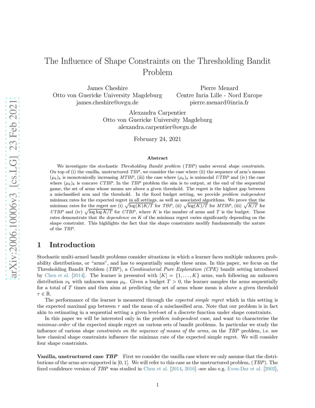 We investigate the stochastic Thresholding Bandit problem (TBP) under several shape constraints. On top of (i) the vanilla, unstructured TBP, we consider the case where (ii) the sequence of arm's means is monotonically increasing MTBP, (iii) the case where is unimodal UTBP and (iv) the case where is concave CTBP. In the TBP problem the aim is to output, at the end of the sequential game, the set of arms whose means are above a given threshold. The regret is the highest gap between a misclassified arm and the threshold. In the fixed budget setting, we provide problem independent minimax rates for the expected regret in all settings, as well as associated algorithms. We prove that the minimax rates for the regret are (i) for TBP, (ii) for MTBP, (iii) for UTBP and (iv) for CTBP, where is the number of arms and is the budget. These rates demonstrate that the dependence on of the minimax regret varies significantly depending on the shape constraint. This highlights the fact that the shape constraints modify fundamentally the nature of the TBP.