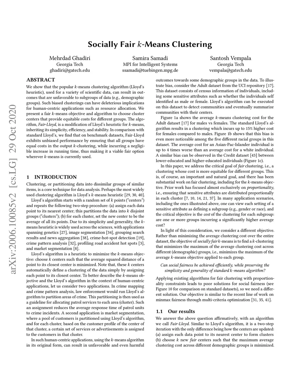 We show that the popular k-means clustering algorithm (Lloyd's heuristic), used for a variety of scientific data, can result in outcomes that are unfavorable to subgroups of data (e.g., demographic groups). Such biased clusterings can have deleterious implications for human-centric applications such as resource allocation. We present a fair k-means objective and algorithm to choose cluster centers that provide equitable costs for different groups. The algorithm, Fair-Lloyd, is a modification of Lloyd's heuristic for k-means, inheriting its simplicity, efficiency, and stability. In comparison with standard Lloyd's, we find that on benchmark datasets, Fair-Lloyd exhibits unbiased performance by ensuring that all groups have equal costs in the output k-clustering, while incurring a negligible increase in running time, thus making it a viable fair option wherever k-means is currently used.