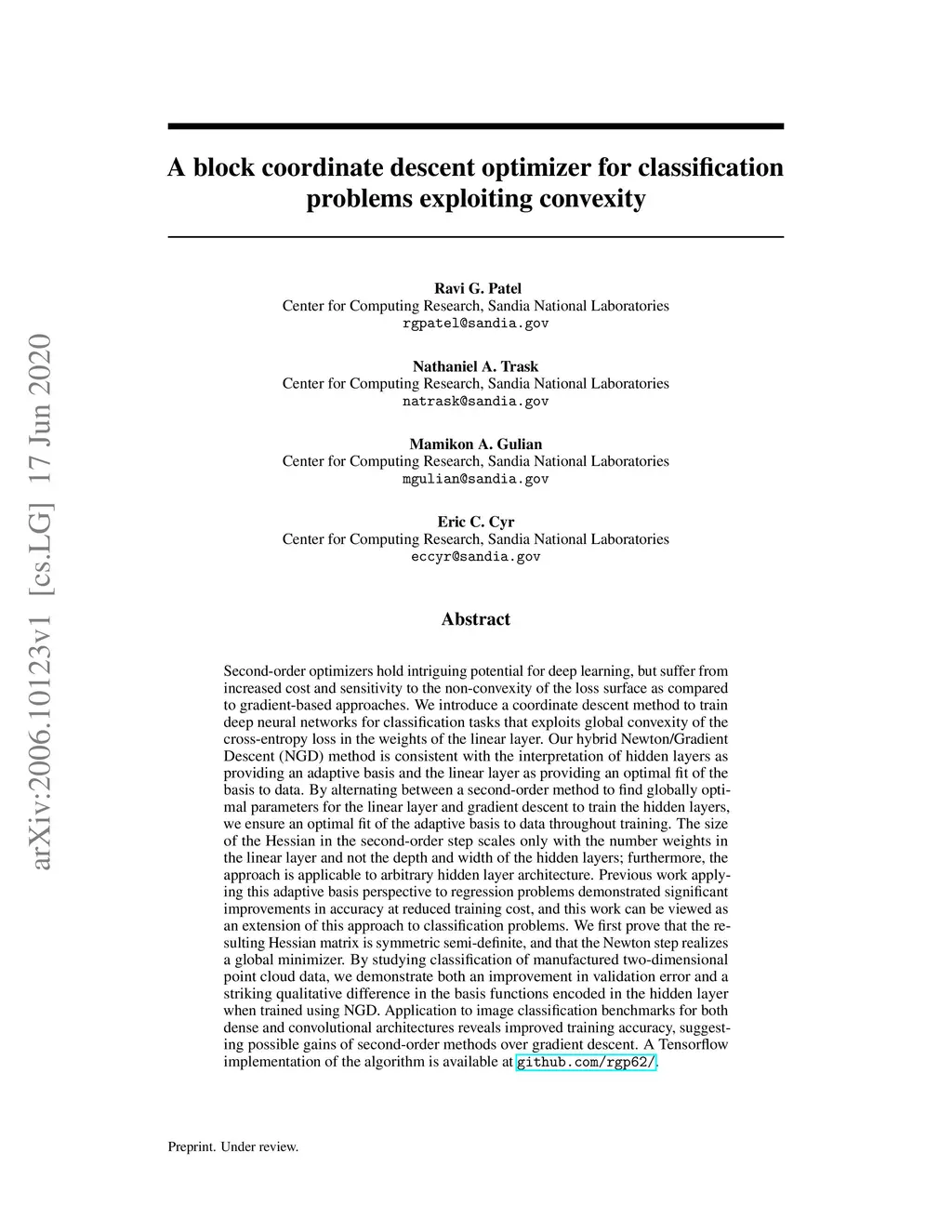 Second-order optimizers hold intriguing potential for deep learning, but suffer from increased cost and sensitivity to the non-convexity of the loss surface as compared to gradient-based approaches. We introduce a coordinate descent method to train deep neural networks for classification tasks that exploits global convexity of the cross-entropy loss in the weights of the linear layer. Our hybrid Newton/Gradient Descent (NGD) method is consistent with the interpretation of hidden layers as providing an adaptive basis and the linear layer as providing an optimal fit of the basis to data. By alternating between a second-order method to find globally optimal parameters for the linear layer and gradient descent to train the hidden layers, we ensure an optimal fit of the adaptive basis to data throughout training. The size of the Hessian in the second-order step scales only with the number weights in the linear layer and not the depth and width of the hidden layers; furthermore, the approach is applicable to arbitrary hidden layer architecture. Previous work applying this adaptive basis perspective to regression problems demonstrated significant improvements in accuracy at reduced training cost, and this work can be viewed as an extension of this approach to classification problems. We first prove that the resulting Hessian matrix is symmetric semi-definite, and that the Newton step realizes a global minimizer. By studying classification of manufactured two-dimensional point cloud data, we demonstrate both an improvement in validation error and a striking qualitative difference in the basis functions encoded in the hidden layer when trained using NGD. Application to image classification benchmarks for both dense and convolutional architectures reveals improved training accuracy, suggesting possible gains of second-order methods over gradient descent.