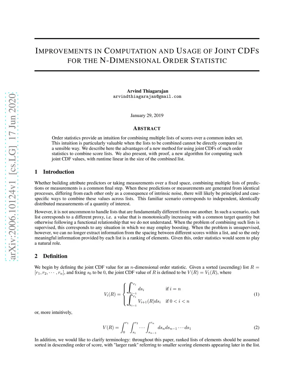 Order statistics provide an intuition for combining multiple lists of scores over a common index set. This intuition is particularly valuable when the lists to be combined cannot be directly compared in a sensible way. We describe here the advantages of a new method for using joint CDFs of such order statistics to combine score lists. We also present, with proof, a new algorithm for computing such joint CDF values, with runtime linear in the size of the combined list.
