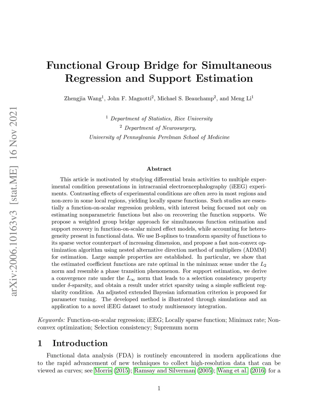This article is motivated by studying multisensory effects on brain activities in intracranial electroencephalography (iEEG) experiments. Differential brain activities to multisensory stimulus presentations are zero in most regions and non-zero in some local regions, yielding locally sparse functions. Such studies are essentially a function-on-scalar regression problem, with interest being focused not only on estimating nonparametric functions but also on recovering the function supports. We propose a weighted group bridge approach for simultaneous function estimation and support recovery in function-on-scalar mixed effect models, while accounting for heterogeneity present in functional data. We use B-splines to transform sparsity of functions to its sparse vector counterpart of increasing dimension, and propose a fast non-convex optimization algorithm using nested alternative direction method of multipliers (ADMM) for estimation. Large sample properties are established. In particular, we show that the estimated coefficient functions are rate optimal in the minimax sense under the norm and resemble a phase transition phenomenon. For support estimation, we derive a convergence rate under the norm that leads to a sparsistency property under -sparsity, and provide a simple sufficient regularity condition under which a strict sparsistency property is established. An adjusted extended Bayesian information criterion is proposed for parameter tuning. The developed method is illustrated through simulation and an application to a novel iEEG dataset to study multisensory integration. We integrate the proposed method into RAVE, an R package that gains increasing popularity in the iEEG community.