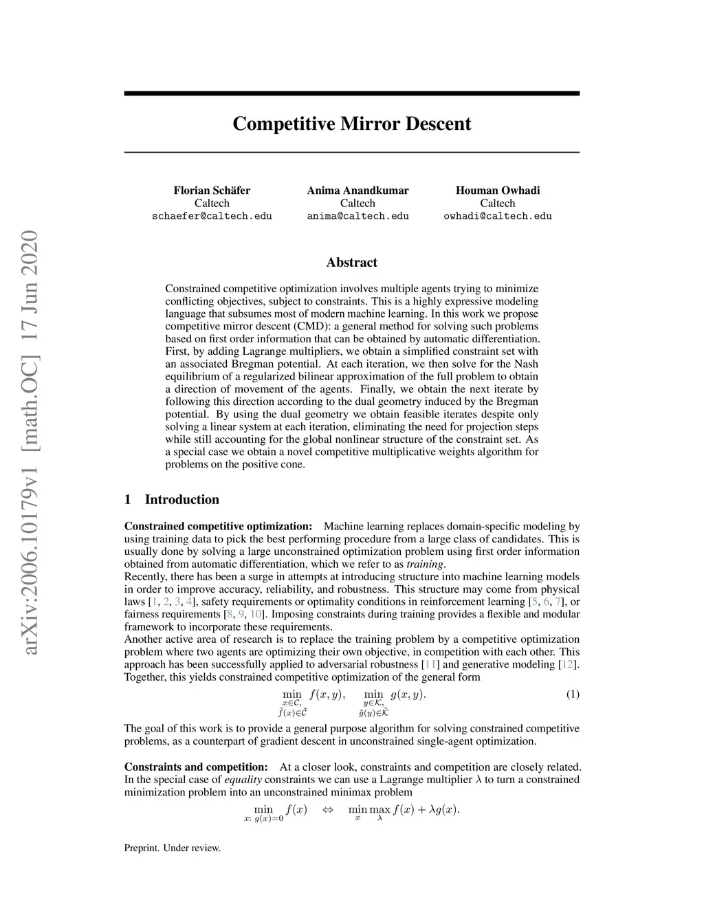 Constrained competitive optimization involves multiple agents trying to minimize conflicting objectives, subject to constraints. This is a highly expressive modeling language that subsumes most of modern machine learning. In this work we propose competitive mirror descent (CMD): a general method for solving such problems based on first order information that can be obtained by automatic differentiation. First, by adding Lagrange multipliers, we obtain a simplified constraint set with an associated Bregman potential. At each iteration, we then solve for the Nash equilibrium of a regularized bilinear approximation of the full problem to obtain a direction of movement of the agents. Finally, we obtain the next iterate by following this direction according to the dual geometry induced by the Bregman potential. By using the dual geometry we obtain feasible iterates despite only solving a linear system at each iteration, eliminating the need for projection steps while still accounting for the global nonlinear structure of the constraint set. As a special case we obtain a novel competitive multiplicative weights algorithm for problems on the positive cone.