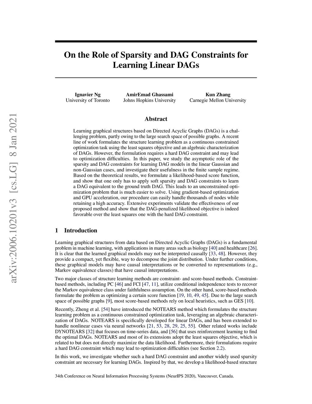 Learning graphical structures based on Directed Acyclic Graphs (DAGs) is a challenging problem, partly owing to the large search space of possible graphs. A recent line of work formulates the structure learning problem as a continuous constrained optimization task using the least squares objective and an algebraic characterization of DAGs. However, the formulation requires a hard DAG constraint and may lead to optimization difficulties. In this paper, we study the asymptotic role of the sparsity and DAG constraints for learning DAG models in the linear Gaussian and non-Gaussian cases, and investigate their usefulness in the finite sample regime. Based on the theoretical results, we formulate a likelihood-based score function, and show that one only has to apply soft sparsity and DAG constraints to learn a DAG equivalent to the ground truth DAG. This leads to an unconstrained optimization problem that is much easier to solve. Using gradient-based optimization and GPU acceleration, our procedure can easily handle thousands of nodes while retaining a high accuracy. Extensive experiments validate the effectiveness of our proposed method and show that the DAG-penalized likelihood objective is indeed favorable over the least squares one with the hard DAG constraint.