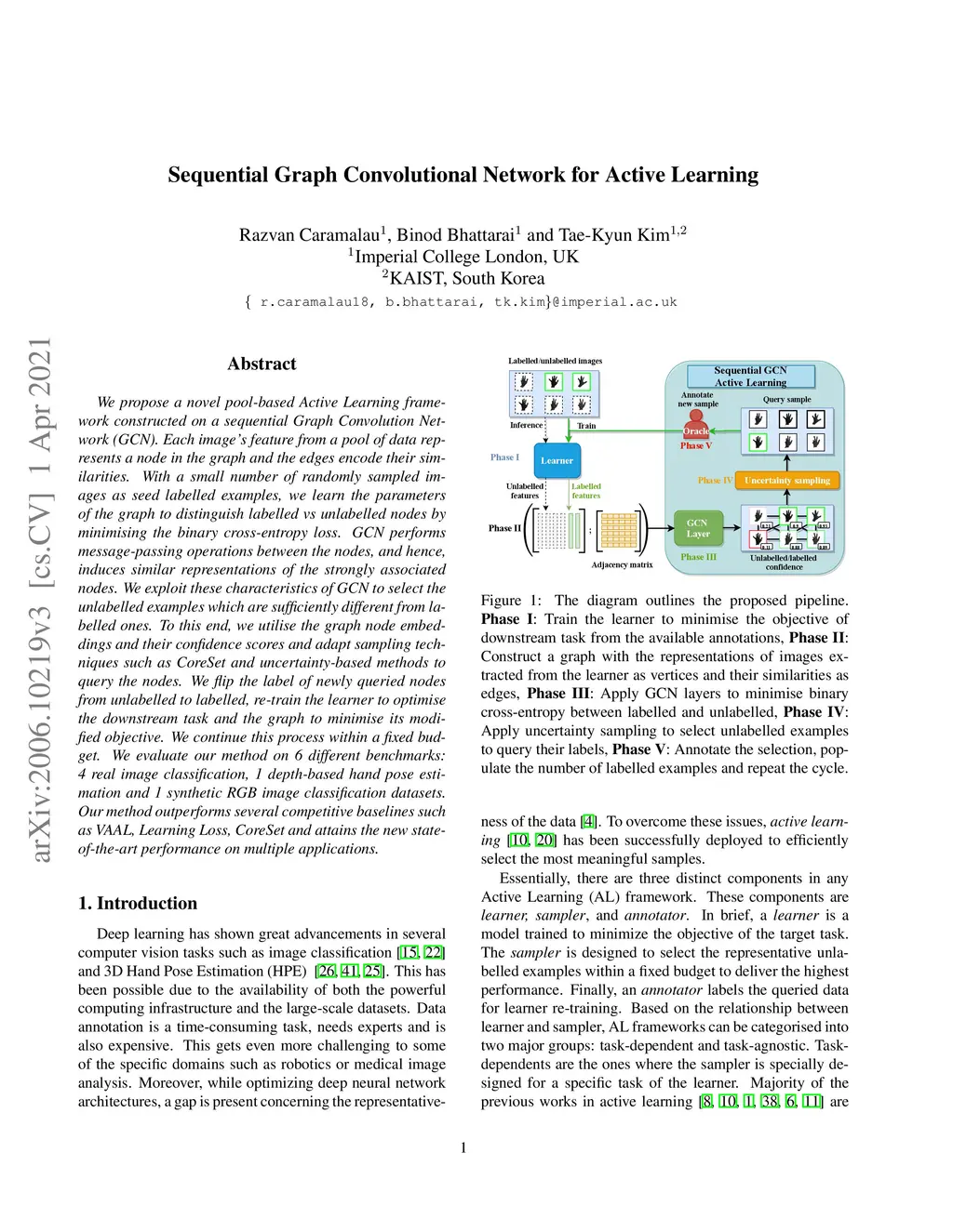 We propose a novel pool-based Active Learning framework constructed on a sequential Graph Convolution Network (GCN). Each image's feature from a pool of data represents a node in the graph and the edges encode their similarities. With a small number of randomly sampled images as seed labelled examples, we learn the parameters of the graph to distinguish labelled vs unlabelled nodes by minimising the binary cross-entropy loss. GCN performs message-passing operations between the nodes, and hence, induces similar representations of the strongly associated nodes. We exploit these characteristics of GCN to select the unlabelled examples which are sufficiently different from labelled ones. To this end, we utilise the graph node embeddings and their confidence scores and adapt sampling techniques such as CoreSet and uncertainty-based methods to query the nodes. We flip the label of newly queried nodes from unlabelled to labelled, re-train the learner to optimise the downstream task and the graph to minimise its modified objective. We continue this process within a fixed budget. We evaluate our method on 6 different benchmarks:4 real image classification, 1 depth-based hand pose estimation and 1 synthetic RGB image classification datasets. Our method outperforms several competitive baselines such as VAAL, Learning Loss, CoreSet and attains the new state-of-the-art performance on multiple applications The implementations can be found here: https://github.com/razvancaramalau/Sequential-GCN-for-Active-Learning