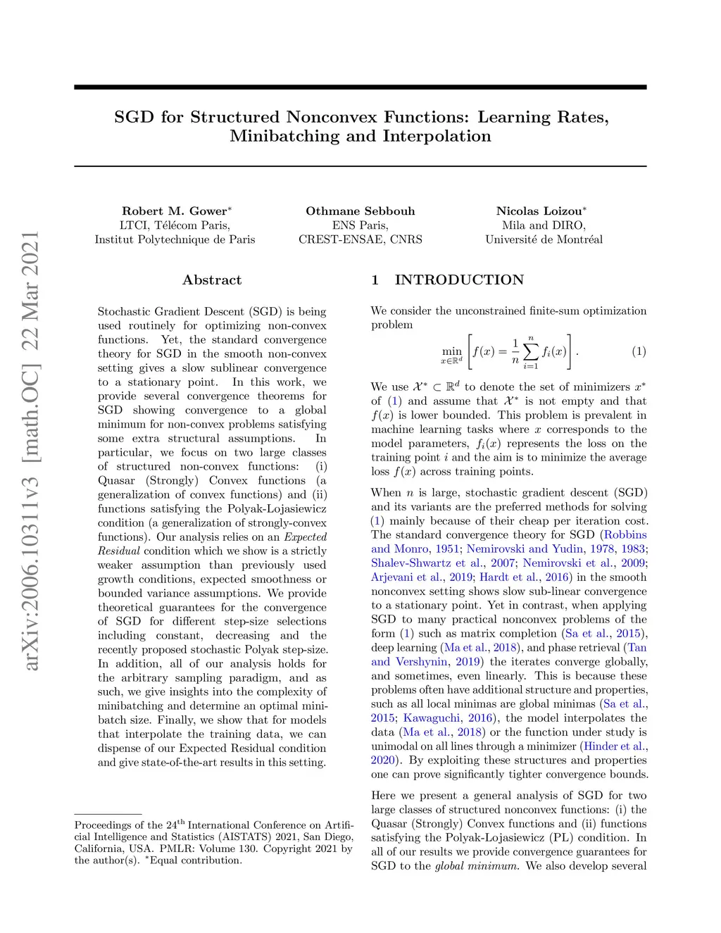Stochastic Gradient Descent (SGD) is being used routinely for optimizing non-convex functions. Yet, the standard convergence theory for SGD in the smooth non-convex setting gives a slow sublinear convergence to a stationary point. In this work, we provide several convergence theorems for SGD showing convergence to a global minimum for non-convex problems satisfying some extra structural assumptions. In particular, we focus on two large classes of structured non-convex functions: (i) Quasar (Strongly) Convex functions (a generalization of convex functions) and (ii) functions satisfying the Polyak-Lojasiewicz condition (a generalization of strongly-convex functions). Our analysis relies on an Expected Residual condition which we show is a strictly weaker assumption than previously used growth conditions, expected smoothness or bounded variance assumptions. We provide theoretical guarantees for the convergence of SGD for different step-size selections including constant, decreasing and the recently proposed stochastic Polyak step-size. In addition, all of our analysis holds for the arbitrary sampling paradigm, and as such, we give insights into the complexity of minibatching and determine an optimal minibatch size. Finally, we show that for models that interpolate the training data, we can dispense of our Expected Residual condition and give state-of-the-art results in this setting.
