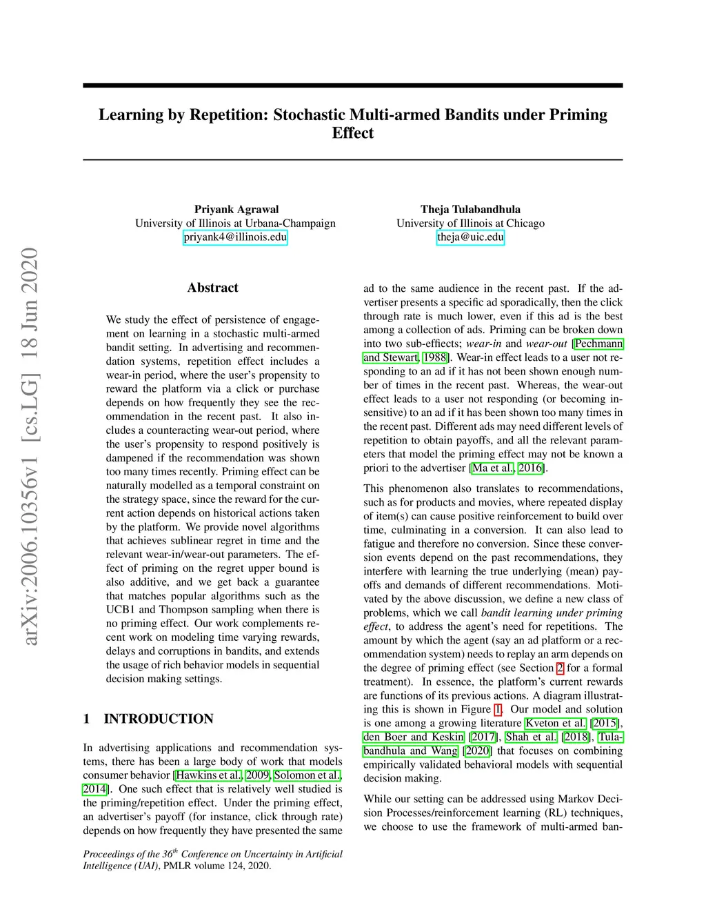 We study the effect of persistence of engagement on learning in a stochastic multi-armed bandit setting. In advertising and recommendation systems, repetition effect includes a wear-in period, where the user's propensity to reward the platform via a click or purchase depends on how frequently they see the recommendation in the recent past. It also includes a counteracting wear-out period, where the user's propensity to respond positively is dampened if the recommendation was shown too many times recently. Priming effect can be naturally modelled as a temporal constraint on the strategy space, since the reward for the current action depends on historical actions taken by the platform. We provide novel algorithms that achieves sublinear regret in time and the relevant wear-in/wear-out parameters. The effect of priming on the regret upper bound is also additive, and we get back a guarantee that matches popular algorithms such as the UCB1 and Thompson sampling when there is no priming effect. Our work complements recent work on modeling time varying rewards, delays and corruptions in bandits, and extends the usage of rich behavior models in sequential decision making settings.