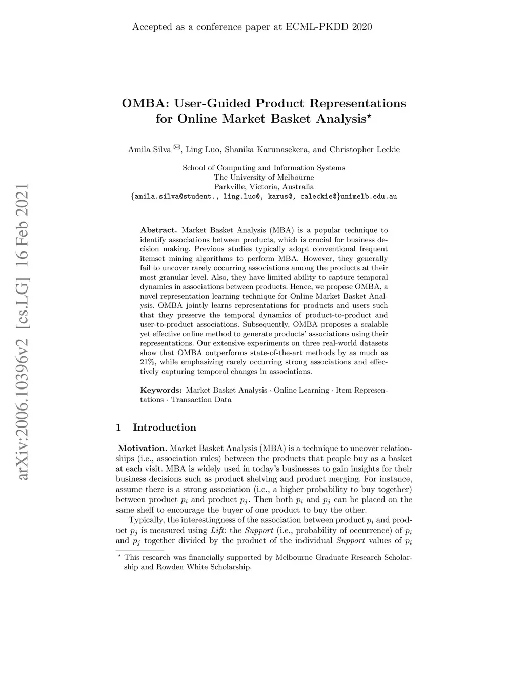 Market Basket Analysis (MBA) is a popular technique to identify associations between products, which is crucial for business decision making. Previous studies typically adopt conventional frequent itemset mining algorithms to perform MBA. However, they generally fail to uncover rarely occurring associations among the products at their most granular level. Also, they have limited ability to capture temporal dynamics in associations between products. Hence, we propose OMBA, a novel representation learning technique for Online Market Basket Analysis. OMBA jointly learns representations for products and users such that they preserve the temporal dynamics of product-to-product and user-to-product associations. Subsequently, OMBA proposes a scalable yet effective online method to generate products' associations using their representations. Our extensive experiments on three real-world datasets show that OMBA outperforms state-of-the-art methods by as much as 21%, while emphasizing rarely occurring strong associations and effectively capturing temporal changes in associations.