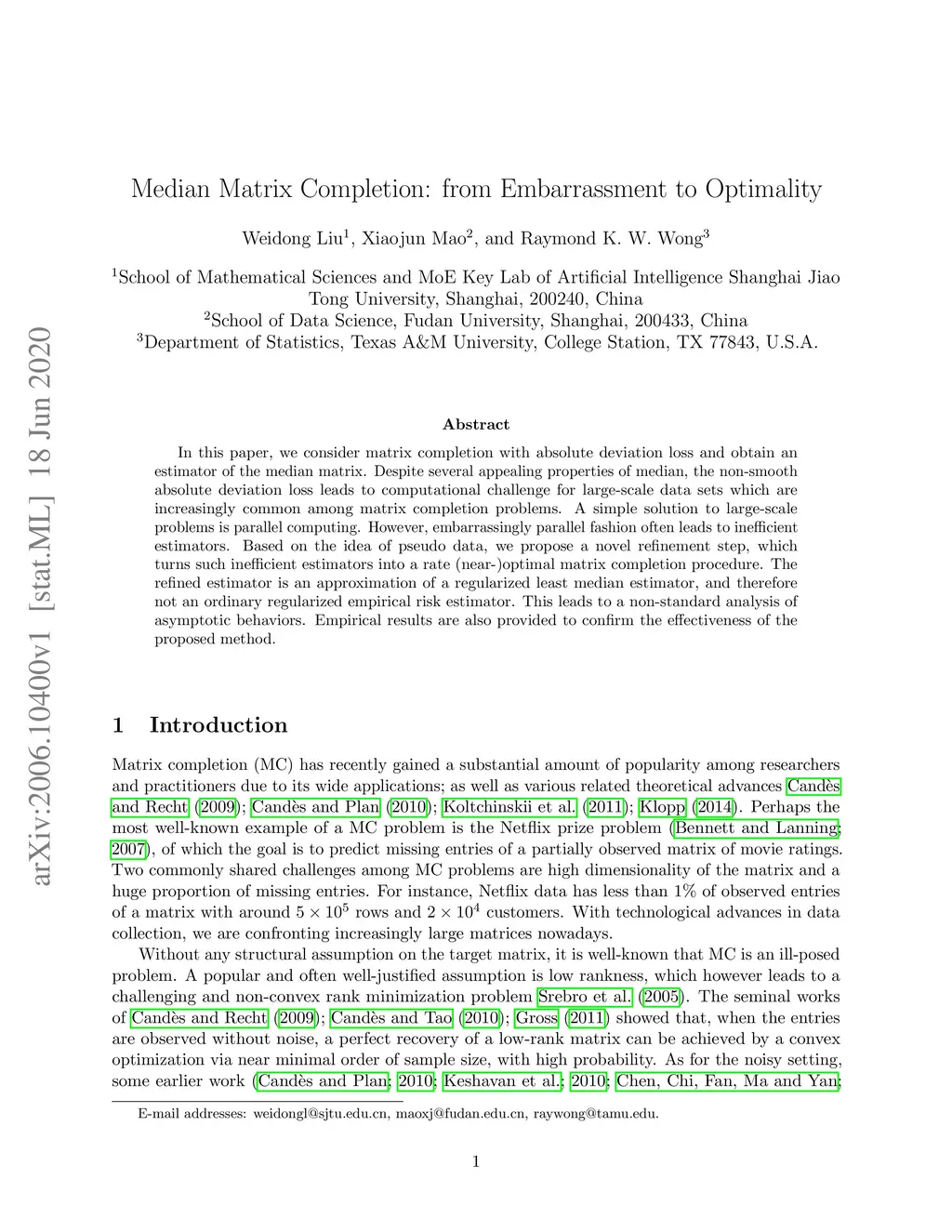 Median Matrix Completion: from Embarrassment to Optimality