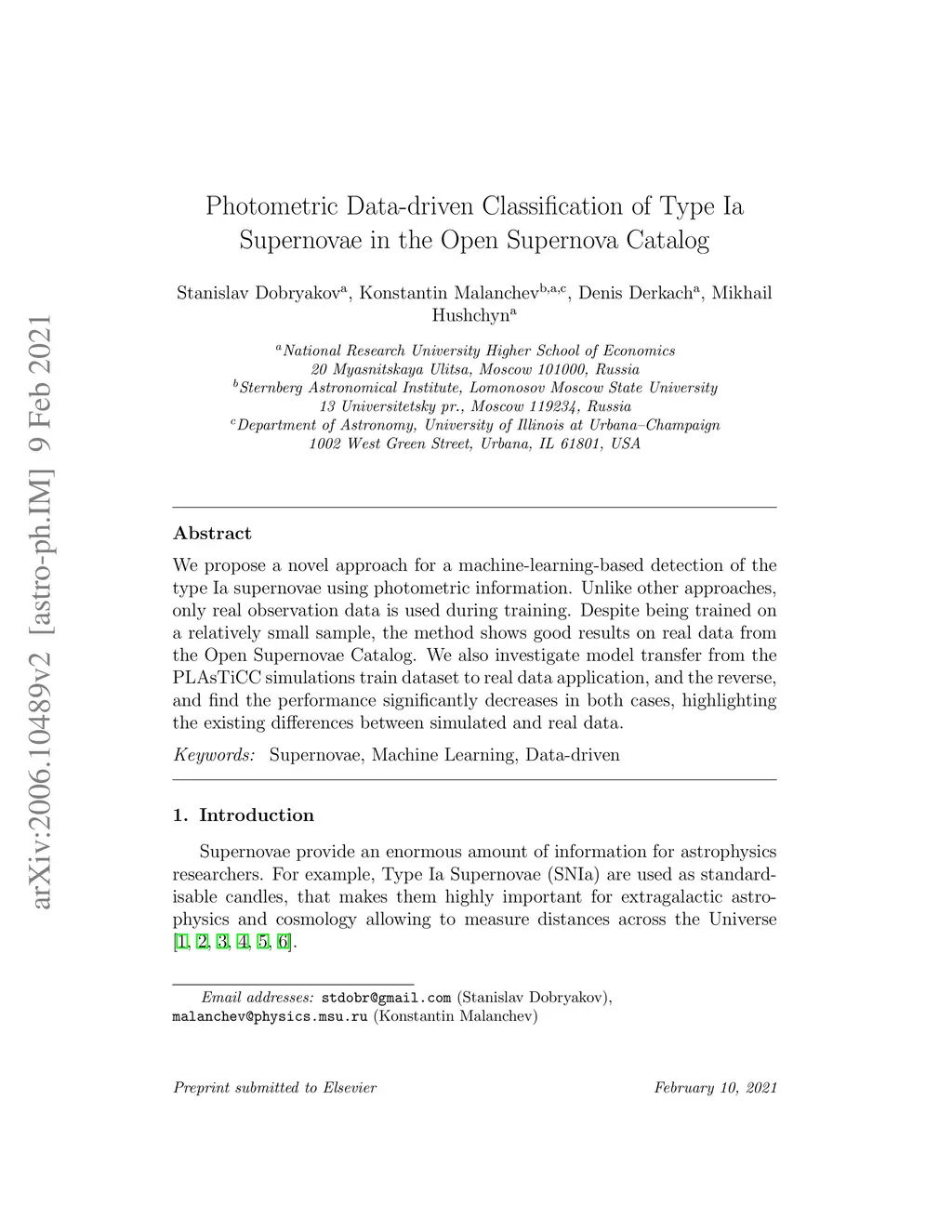 We propose a novel approach for a machine-learning-based detection of the type Ia supernovae using photometric information. Unlike other approaches, only real observation data is used during training. Despite being trained on a relatively small sample, the method shows good results on real data from the Open Supernovae Catalog. We also investigate model transfer from the PLAsTiCC simulations train dataset to real data application, and the reverse, and find the performance significantly decreases in both cases, highlighting the existing differences between simulated and real data.