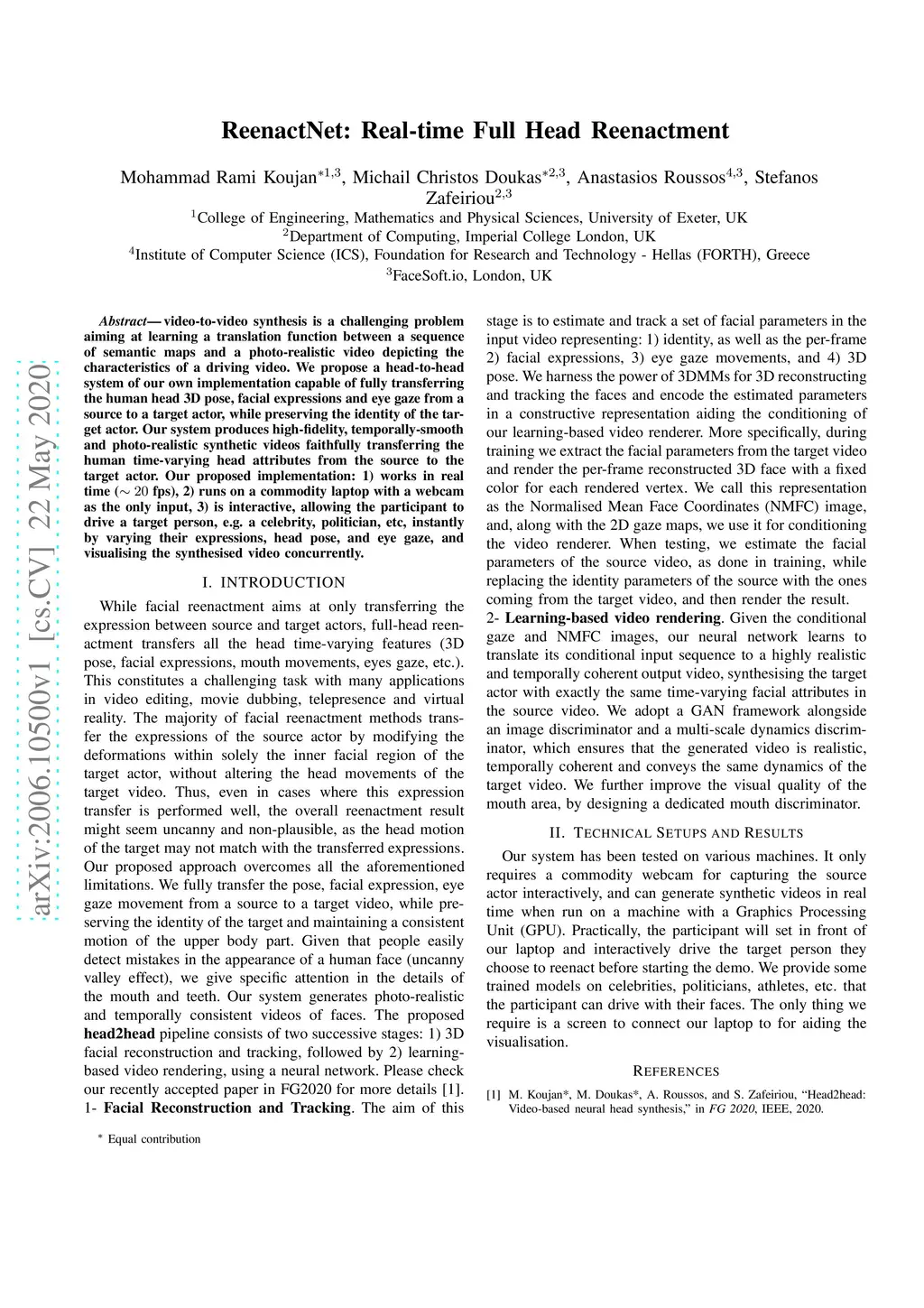 Video-to-video synthesis is a challenging problem aiming at learning a translation function between a sequence of semantic maps and a photo-realistic video depicting the characteristics of a driving video. We propose a head-to-head system of our own implementation capable of fully transferring the human head 3D pose, facial expressions and eye gaze from a source to a target actor, while preserving the identity of the target actor. Our system produces high-fidelity, temporally-smooth and photo-realistic synthetic videos faithfully transferring the human time-varying head attributes from the source to the target actor. Our proposed implementation: 1) works in real time ( fps), 2) runs on a commodity laptop with a webcam as the only input, 3) is interactive, allowing the participant to drive a target person, e.g. a celebrity, politician, etc, instantly by varying their expressions, head pose, and eye gaze, and visualising the synthesised video concurrently.