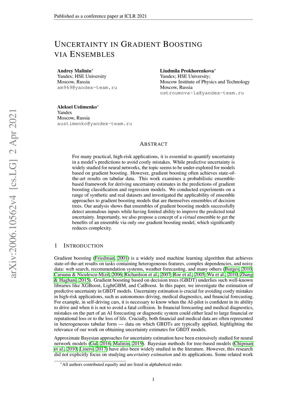 For many practical, high-risk applications, it is essential to quantify uncertainty in a model's predictions to avoid costly mistakes. While predictive uncertainty is widely studied for neural networks, the topic seems to be under-explored for models based on gradient boosting. However, gradient boosting often achieves state-of-the-art results on tabular data. This work examines a probabilistic ensemble-based framework for deriving uncertainty estimates in the predictions of gradient boosting classification and regression models. We conducted experiments on a range of synthetic and real datasets and investigated the applicability of ensemble approaches to gradient boosting models that are themselves ensembles of decision trees. Our analysis shows that ensembles of gradient boosting models successfully detect anomalous inputs while having limited ability to improve the predicted total uncertainty. Importantly, we also propose a concept of a virtual ensemble to get the benefits of an ensemble via only one gradient boosting model, which significantly reduces complexity.