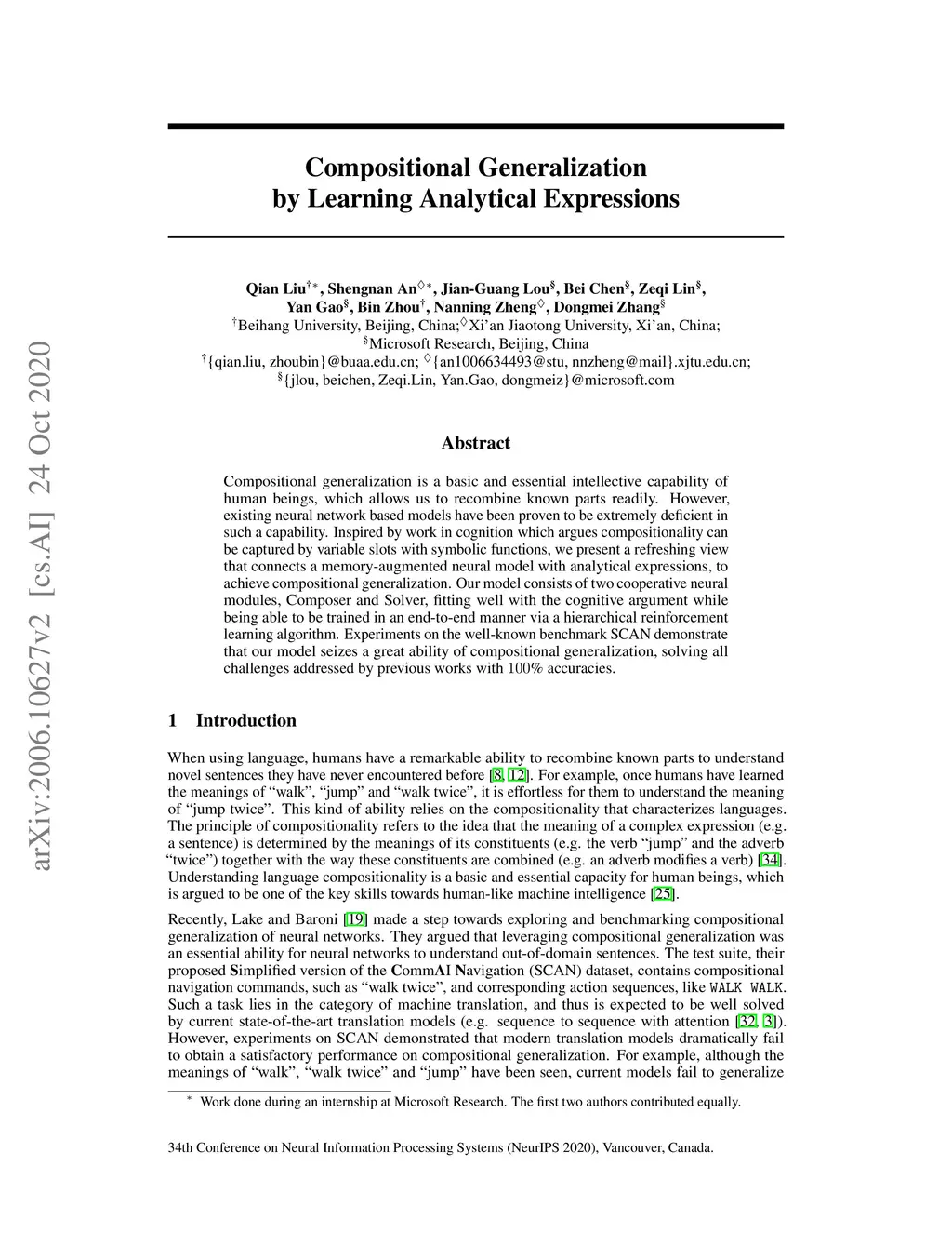 Compositional generalization is a basic and essential intellective capability of human beings, which allows us to recombine known parts readily. However, existing neural network based models have been proven to be extremely deficient in such a capability. Inspired by work in cognition which argues compositionality can be captured by variable slots with symbolic functions, we present a refreshing view that connects a memory-augmented neural model with analytical expressions, to achieve compositional generalization. Our model consists of two cooperative neural modules, Composer and Solver, fitting well with the cognitive argument while being able to be trained in an end-to-end manner via a hierarchical reinforcement learning algorithm. Experiments on the well-known benchmark SCAN demonstrate that our model seizes a great ability of compositional generalization, solving all challenges addressed by previous works with 100% accuracies.