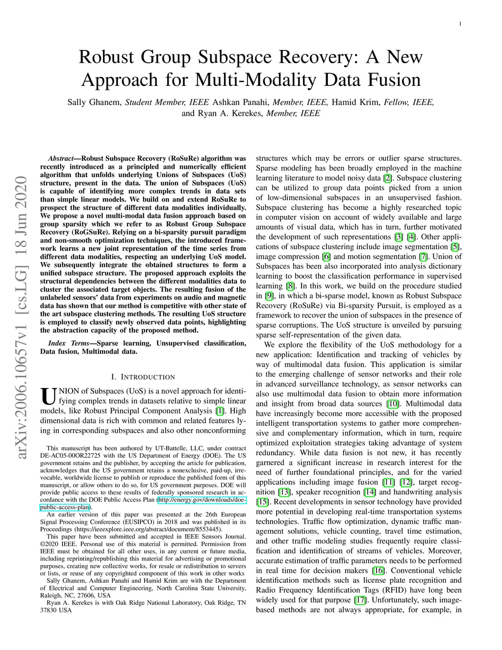 Robust Subspace Recovery (RoSuRe) algorithm was recently introduced as a principled and numerically efficient algorithm that unfolds underlying Unions of Subspaces (UoS) structure, present in the data. The union of Subspaces (UoS) is capable of identifying more complex trends in data sets than simple linear models. We build on and extend RoSuRe to prospect the structure of different data modalities individually. We propose a novel multi-modal data fusion approach based on group sparsity which we refer to as Robust Group Subspace Recovery (RoGSuRe). Relying on a bi-sparsity pursuit paradigm and non-smooth optimization techniques, the introduced framework learns a new joint representation of the time series from different data modalities, respecting an underlying UoS model. We subsequently integrate the obtained structures to form a unified subspace structure. The proposed approach exploits the structural dependencies between the different modalities data to cluster the associated target objects. The resulting fusion of the unlabeled sensors' data from experiments on audio and magnetic data has shown that our method is competitive with other state of the art subspace clustering methods. The resulting UoS structure is employed to classify newly observed data points, highlighting the abstraction capacity of the proposed method.