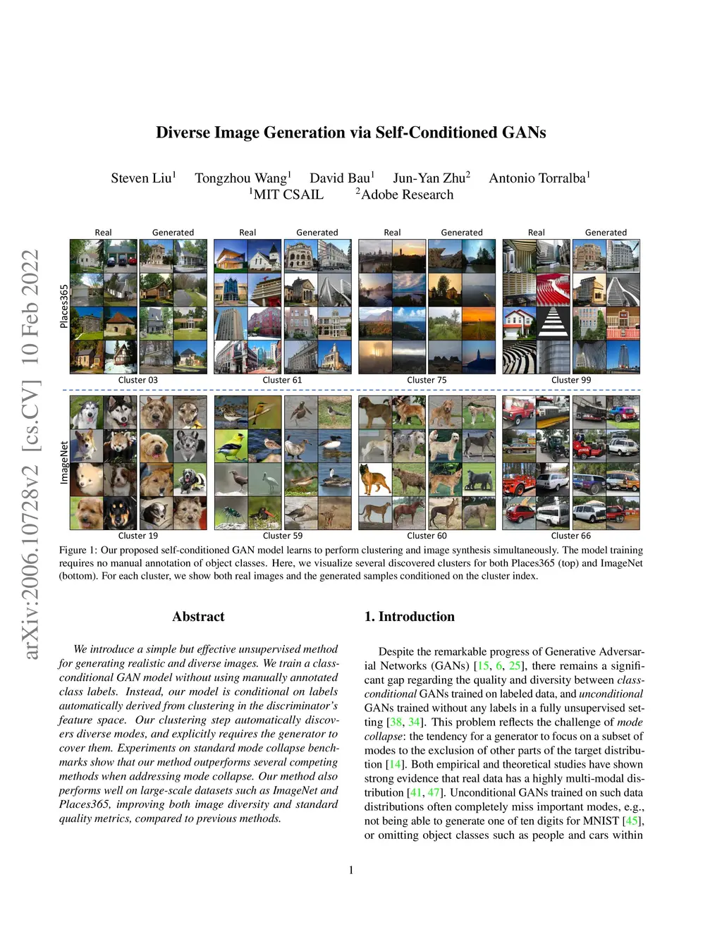 We introduce a simple but effective unsupervised method for generating realistic and diverse images. We train a class-conditional GAN model without using manually annotated class labels. Instead, our model is conditional on labels automatically derived from clustering in the discriminator's feature space. Our clustering step automatically discovers diverse modes, and explicitly requires the generator to cover them. Experiments on standard mode collapse benchmarks show that our method outperforms several competing methods when addressing mode collapse. Our method also performs well on large-scale datasets such as ImageNet and Places365, improving both image diversity and standard quality metrics, compared to previous methods.