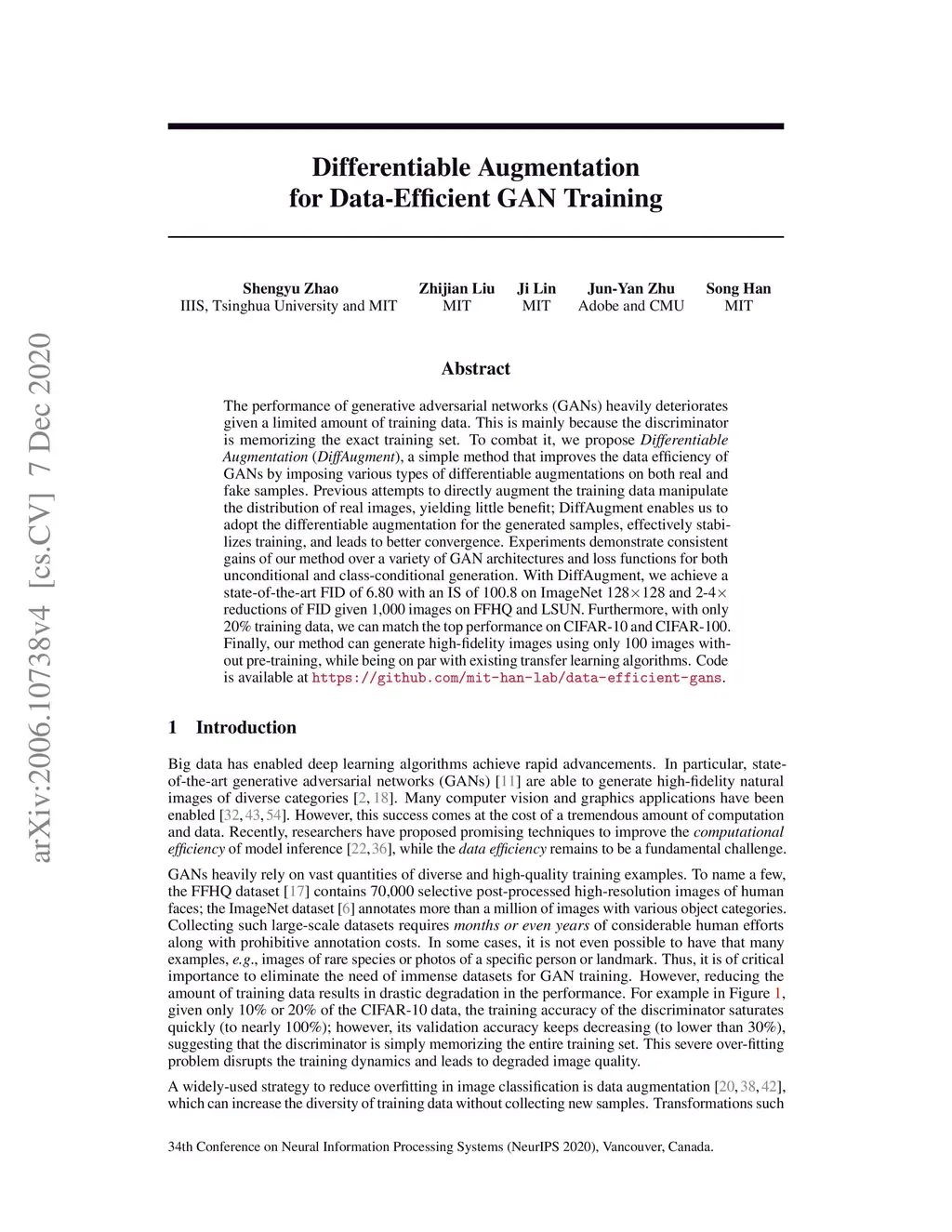 The performance of generative adversarial networks (GANs) heavily deteriorates given a limited amount of training data. This is mainly because the discriminator is memorizing the exact training set. To combat it, we propose Differentiable Augmentation (DiffAugment), a simple method that improves the data efficiency of GANs by imposing various types of differentiable augmentations on both real and fake samples. Previous attempts to directly augment the training data manipulate the distribution of real images, yielding little benefit; DiffAugment enables us to adopt the differentiable augmentation for the generated samples, effectively stabilizes training, and leads to better convergence. Experiments demonstrate consistent gains of our method over a variety of GAN architectures and loss functions for both unconditional and class-conditional generation. With DiffAugment, we achieve a state-of-the-art FID of 6.80 with an IS of 100.8 on ImageNet 128x128 and 2-4x reductions of FID given 1,000 images on FFHQ and LSUN. Furthermore, with only 20% training data, we can match the top performance on CIFAR-10 and CIFAR-100. Finally, our method can generate high-fidelity images using only 100 images without pre-training, while being on par with existing transfer learning algorithms. Code is available at https://github.com/mit-han-lab/data-efficient-gans.