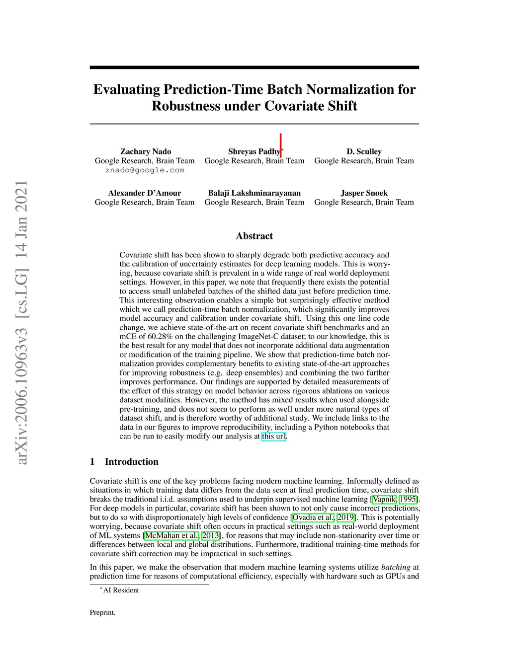 Covariate shift has been shown to sharply degrade both predictive accuracy and the calibration of uncertainty estimates for deep learning models. This is worrying, because covariate shift is prevalent in a wide range of real world deployment settings. However, in this paper, we note that frequently there exists the potential to access small unlabeled batches of the shifted data just before prediction time. This interesting observation enables a simple but surprisingly effective method which we call prediction-time batch normalization, which significantly improves model accuracy and calibration under covariate shift. Using this one line code change, we achieve state-of-the-art on recent covariate shift benchmarks and an mCE of 60.28\% on the challenging ImageNet-C dataset; to our knowledge, this is the best result for any model that does not incorporate additional data augmentation or modification of the training pipeline. We show that prediction-time batch normalization provides complementary benefits to existing state-of-the-art approaches for improving robustness (e.g. deep ensembles) and combining the two further improves performance. Our findings are supported by detailed measurements of the effect of this strategy on model behavior across rigorous ablations on various dataset modalities. However, the method has mixed results when used alongside pre-training, and does not seem to perform as well under more natural types of dataset shift, and is therefore worthy of additional study. We include links to the data in our figures to improve reproducibility, including a Python notebooks that can be run to easily modify our analysis at https://colab.research.google.com/drive/11N0wDZnMQQuLrRwRoumDCrhSaIhkqjof.