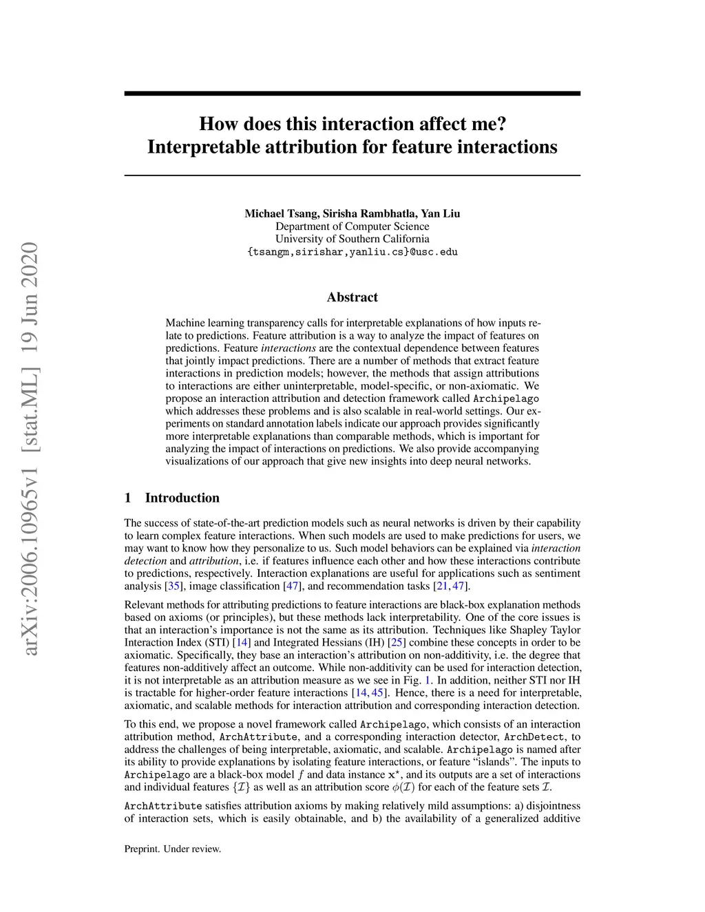 Machine learning transparency calls for interpretable explanations of how inputs relate to predictions. Feature attribution is a way to analyze the impact of features on predictions. Feature interactions are the contextual dependence between features that jointly impact predictions. There are a number of methods that extract feature interactions in prediction models; however, the methods that assign attributions to interactions are either uninterpretable, model-specific, or non-axiomatic. We propose an interaction attribution and detection framework called Archipelago which addresses these problems and is also scalable in real-world settings. Our experiments on standard annotation labels indicate our approach provides significantly more interpretable explanations than comparable methods, which is important for analyzing the impact of interactions on predictions. We also provide accompanying visualizations of our approach that give new insights into deep neural networks.