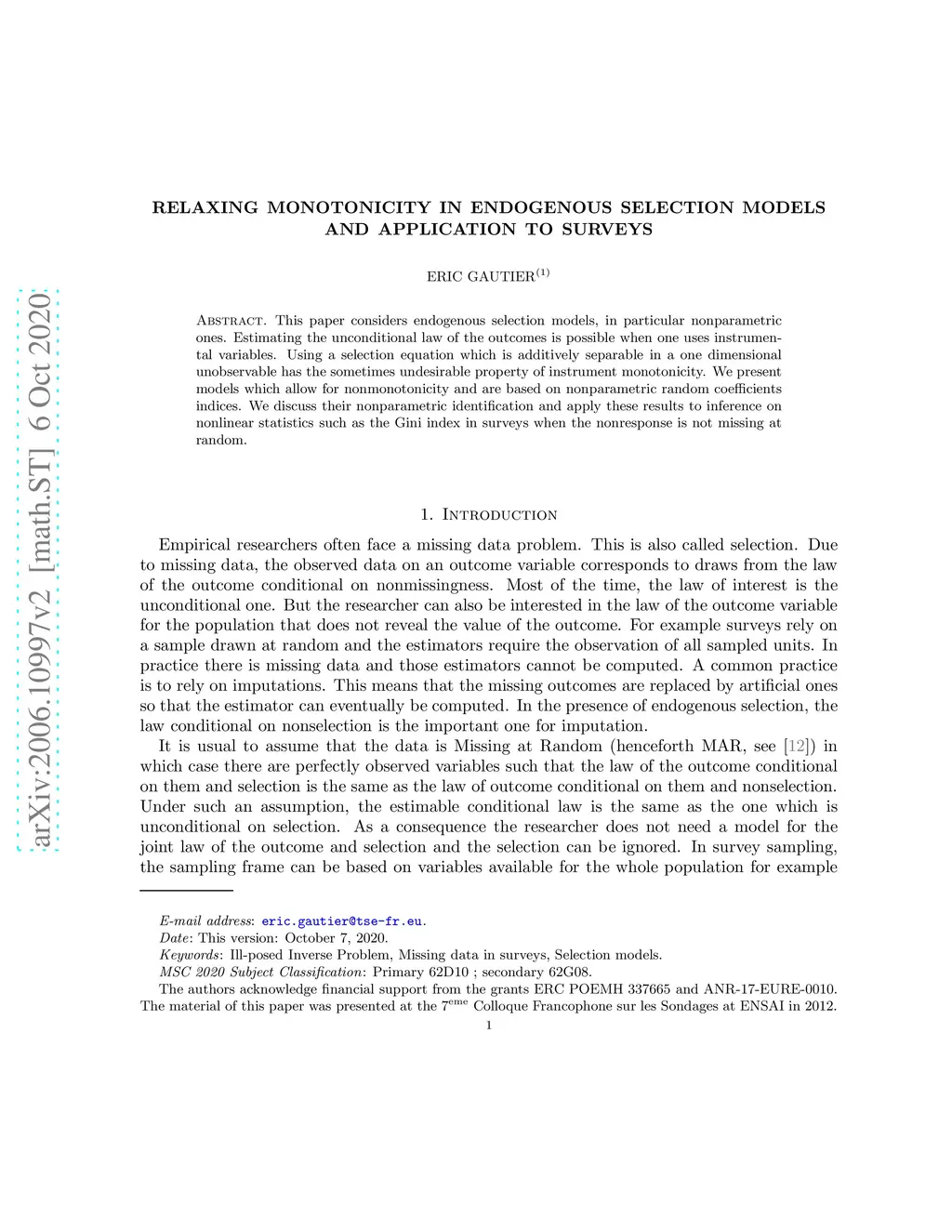This paper considers endogenous selection models, in particular nonparametric ones. Estimating the unconditional law of the outcomes is possible when one uses instrumental variables. Using a selection equation which is additively separable in a one dimensional unobservable has the sometimes undesirable property of instrument monotonicity. We present models which allow for nonmonotonicity and are based on nonparametric random coefficients indices. We discuss their nonparametric identification and apply these results to inference on nonlinear statistics such as the Gini index in surveys when the nonresponse is not missing at random.