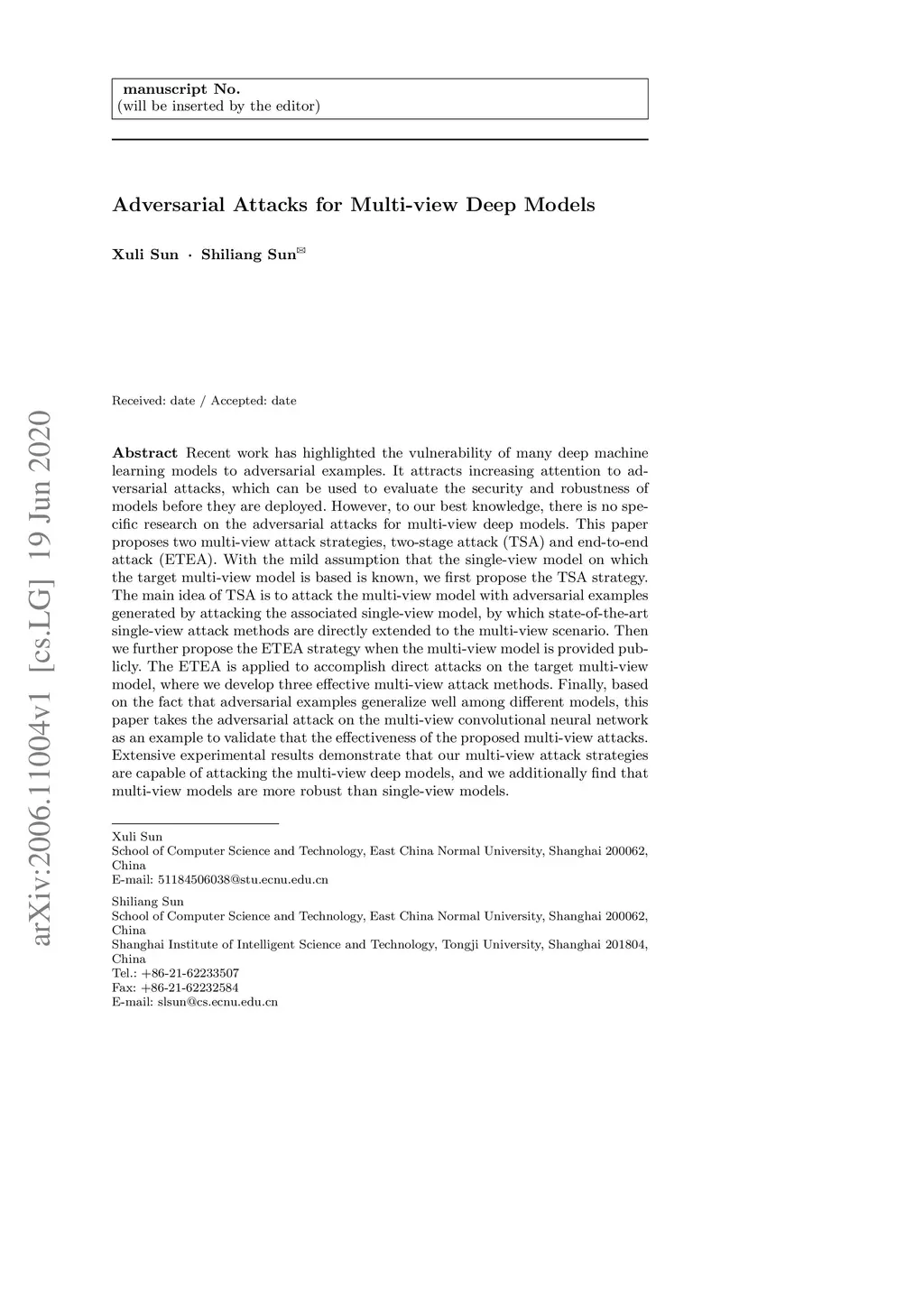 Recent work has highlighted the vulnerability of many deep machine learning models to adversarial examples. It attracts increasing attention to adversarial attacks, which can be used to evaluate the security and robustness of models before they are deployed. However, to our best knowledge, there is no specific research on the adversarial attacks for multi-view deep models. This paper proposes two multi-view attack strategies, two-stage attack (TSA) and end-to-end attack (ETEA). With the mild assumption that the single-view model on which the target multi-view model is based is known, we first propose the TSA strategy. The main idea of TSA is to attack the multi-view model with adversarial examples generated by attacking the associated single-view model, by which state-of-the-art single-view attack methods are directly extended to the multi-view scenario. Then we further propose the ETEA strategy when the multi-view model is provided publicly. The ETEA is applied to accomplish direct attacks on the target multi-view model, where we develop three effective multi-view attack methods. Finally, based on the fact that adversarial examples generalize well among different models, this paper takes the adversarial attack on the multi-view convolutional neural network as an example to validate that the effectiveness of the proposed multi-view attacks. Extensive experimental results demonstrate that our multi-view attack strategies are capable of attacking the multi-view deep models, and we additionally find that multi-view models are more robust than single-view models.