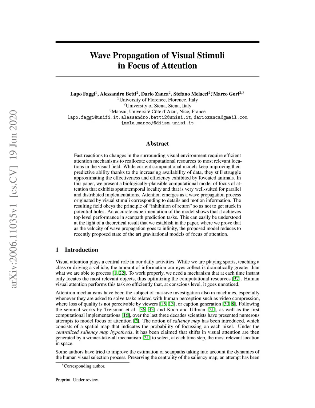 Fast reactions to changes in the surrounding visual environment require efficient attention mechanisms to reallocate computational resources to most relevant locations in the visual field. While current computational models keep improving their predictive ability thanks to the increasing availability of data, they still struggle approximating the effectiveness and efficiency exhibited by foveated animals. In this paper, we present a biologically-plausible computational model of focus of attention that exhibits spatiotemporal locality and that is very well-suited for parallel and distributed implementations. Attention emerges as a wave propagation process originated by visual stimuli corresponding to details and motion information. The resulting field obeys the principle of "inhibition of return" so as not to get stuck in potential holes. An accurate experimentation of the model shows that it achieves top level performance in scanpath prediction tasks. This can easily be understood at the light of a theoretical result that we establish in the paper, where we prove that as the velocity of wave propagation goes to infinity, the proposed model reduces to recently proposed state of the art gravitational models of focus of attention.