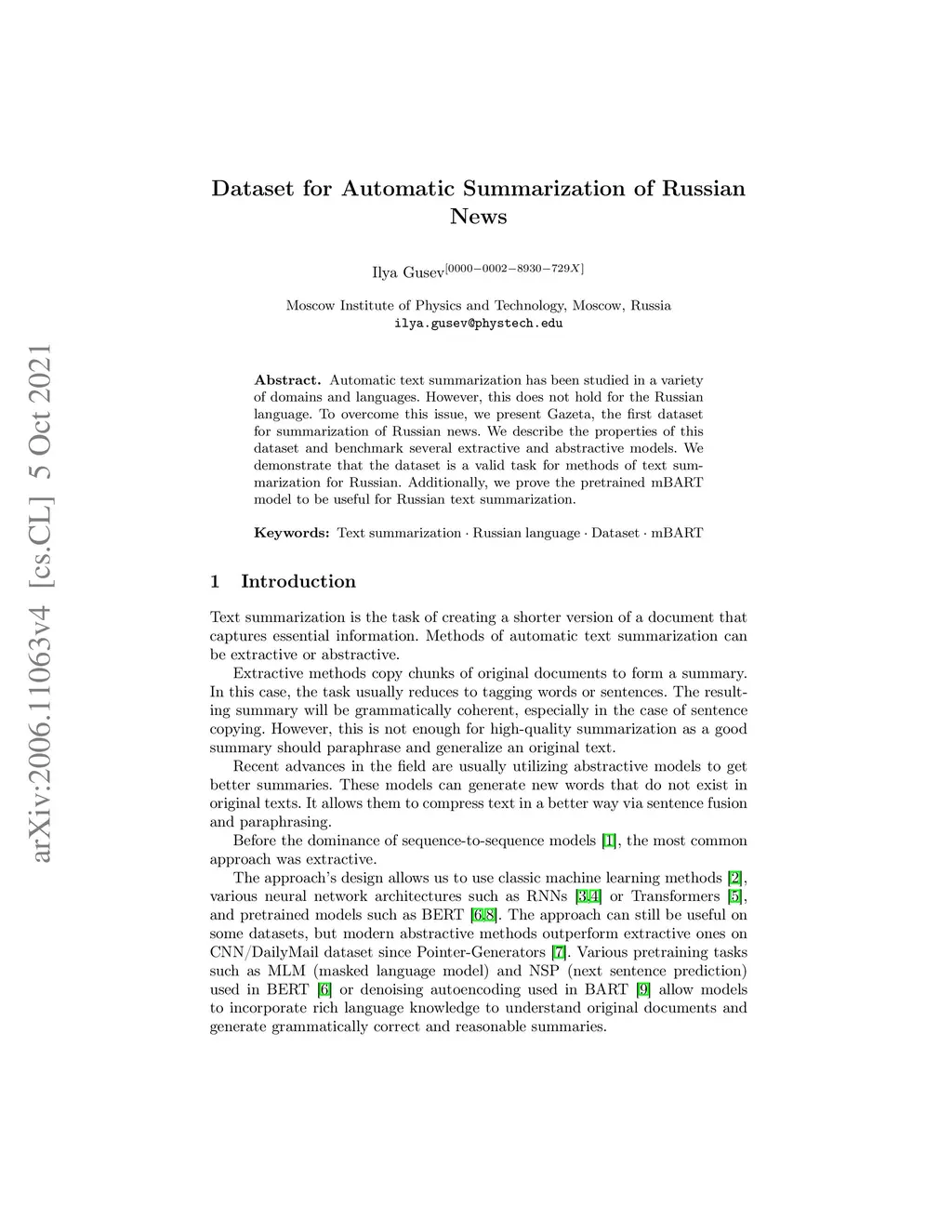 Dataset for Automatic Summarization of Russian News