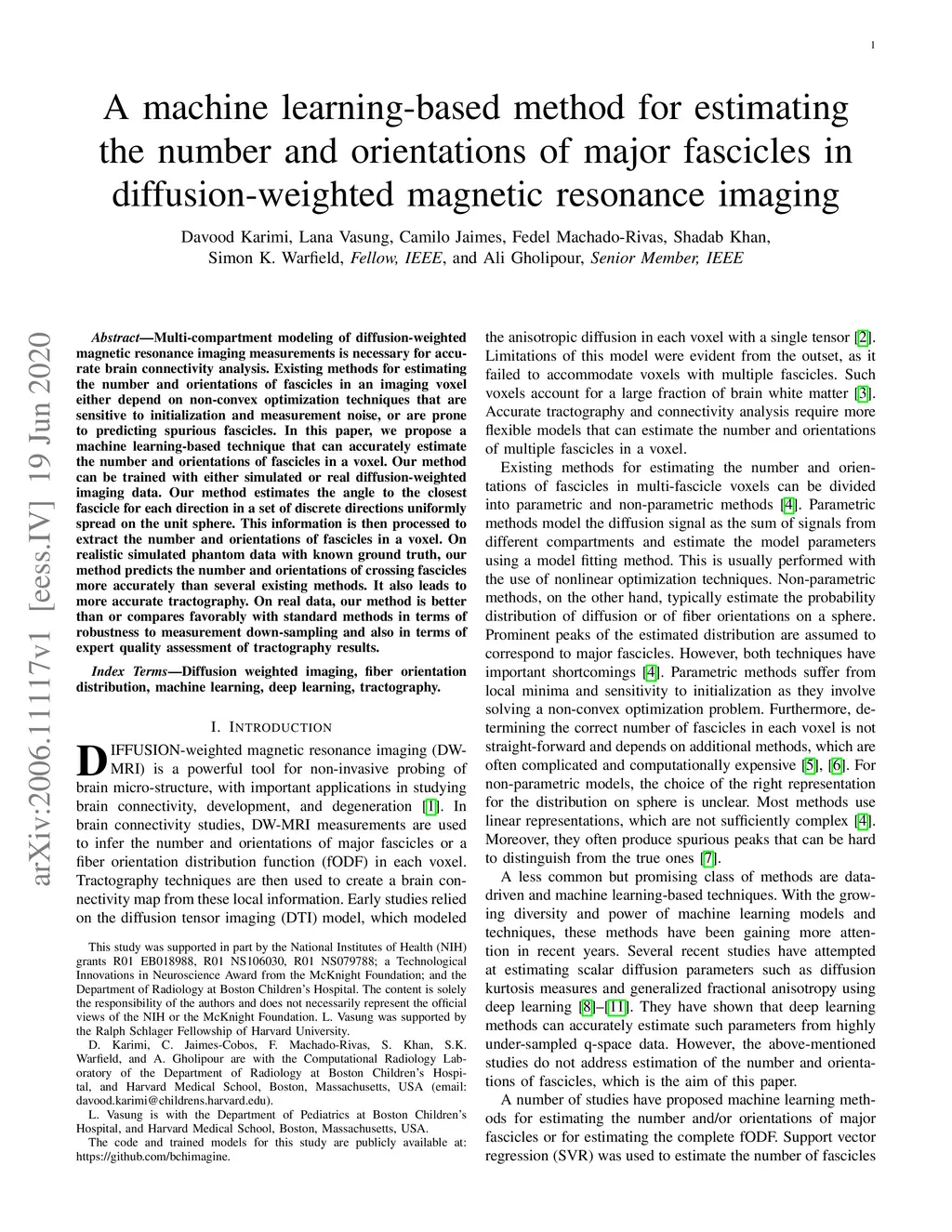 Multi-compartment modeling of diffusion-weighted magnetic resonance imaging measurements is necessary for accurate brain connectivity analysis. Existing methods for estimating the number and orientations of fascicles in an imaging voxel either depend on non-convex optimization techniques that are sensitive to initialization and measurement noise, or are prone to predicting spurious fascicles. In this paper, we propose a machine learning-based technique that can accurately estimate the number and orientations of fascicles in a voxel. Our method can be trained with either simulated or real diffusion-weighted imaging data. Our method estimates the angle to the closest fascicle for each direction in a set of discrete directions uniformly spread on the unit sphere. This information is then processed to extract the number and orientations of fascicles in a voxel. On realistic simulated phantom data with known ground truth, our method predicts the number and orientations of crossing fascicles more accurately than several existing methods. It also leads to more accurate tractography. On real data, our method is better than or compares favorably with standard methods in terms of robustness to measurement down-sampling and also in terms of expert quality assessment of tractography results.