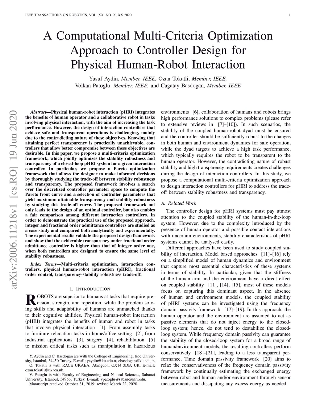 Physical human-robot interaction (pHRI) integrates the benefits of human operator and a collaborative robot in tasks involving physical interaction, with the aim of increasing the task performance. However, the design of interaction controllers that achieve safe and transparent operations is challenging, mainly due to the contradicting nature of these objectives. Knowing that attaining perfect transparency is practically unachievable, controllers that allow better compromise between these objectives are desirable. In this paper, we propose a multi-criteria optimization framework, which jointly optimizes the stability robustness and transparency of a closed-loop pHRI system for a given interaction controller. In particular, we propose a Pareto optimization framework that allows the designer to make informed decisions by thoroughly studying the trade-off between stability robustness and transparency. The proposed framework involves a search over the discretized controller parameter space to compute the Pareto front curve and a selection of controller parameters that yield maximum attainable transparency and stability robustness by studying this trade-off curve. The proposed framework not only leads to the design of an optimal controller, but also enables a fair comparison among different interaction controllers. In order to demonstrate the practical use of the proposed approach, integer and fractional order admittance controllers are studied as a case study and compared both analytically and experimentally. The experimental results validate the proposed design framework and show that the achievable transparency under fractional order admittance controller is higher than that of integer order one, when both controllers are designed to ensure the same level of stability robustness.