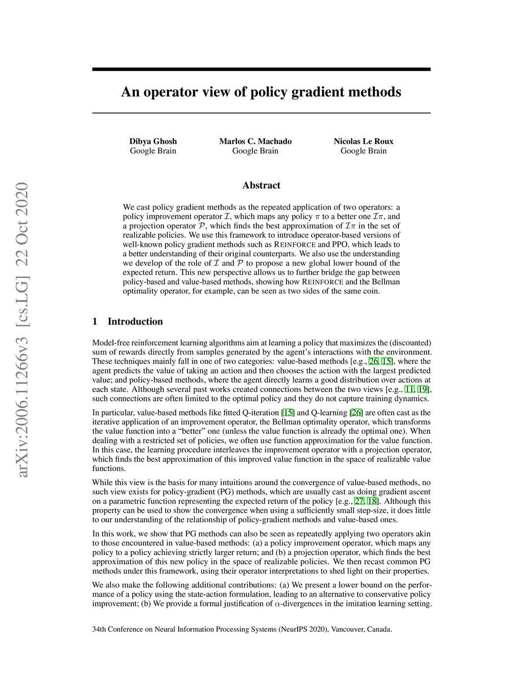 We cast policy gradient methods as the repeated application of two operators: a policy improvement operator , which maps any policy to a better one , and a projection operator , which finds the best approximation of in the set of realizable policies. We use this framework to introduce operator-based versions of traditional policy gradient methods such as REINFORCE and PPO, which leads to a better understanding of their original counterparts. We also use the understanding we develop of the role of and to propose a new global lower bound of the expected return. This new perspective allows us to further bridge the gap between policy-based and value-based methods, showing how REINFORCE and the Bellman optimality operator, for example, can be seen as two sides of the same coin.