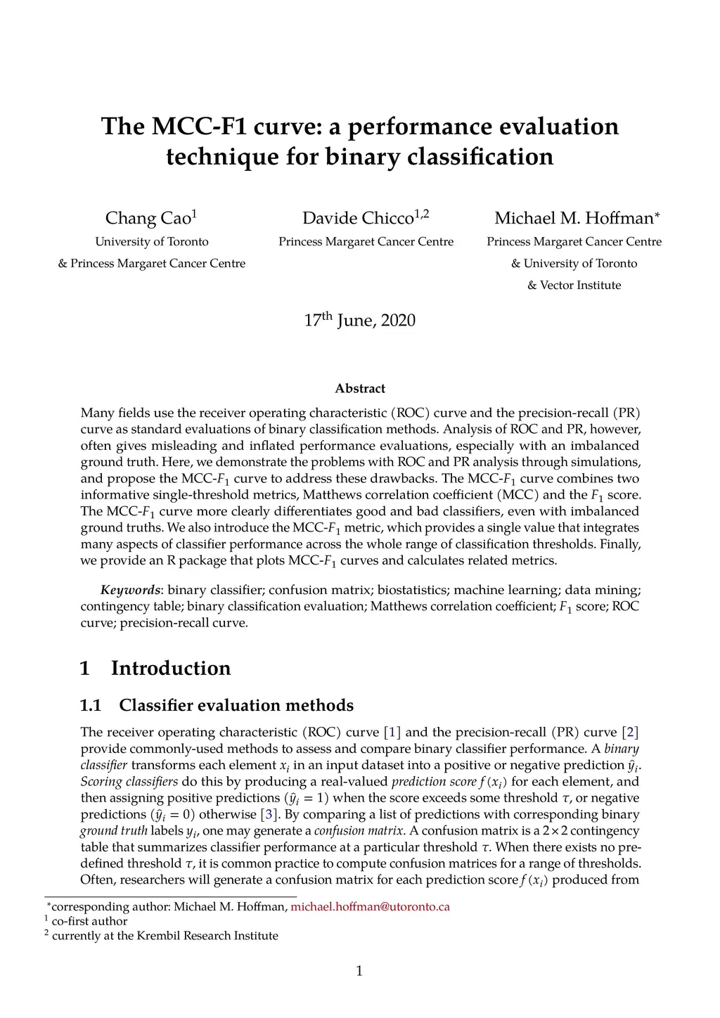 Many fields use the ROC curve and the PR curve as standard evaluations of binary classification methods. Analysis of ROC and PR, however, often gives misleading and inflated performance evaluations, especially with an imbalanced ground truth. Here, we demonstrate the problems with ROC and PR analysis through simulations, and propose the MCC-F1 curve to address these drawbacks. The MCC-F1 curve combines two informative single-threshold metrics, MCC and the F1 score. The MCC-F1 curve more clearly differentiates good and bad classifiers, even with imbalanced ground truths. We also introduce the MCC-F1 metric, which provides a single value that integrates many aspects of classifier performance across the whole range of classification thresholds. Finally, we provide an R package that plots MCC-F1 curves and calculates related metrics.