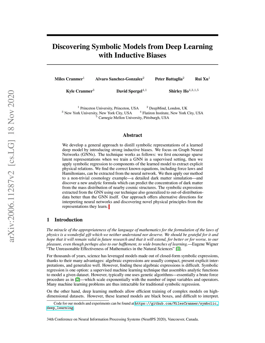 We develop a general approach to distill symbolic representations of a learned deep model by introducing strong inductive biases. We focus on Graph Neural Networks (GNNs). The technique works as follows: we first encourage sparse latent representations when we train a GNN in a supervised setting, then we apply symbolic regression to components of the learned model to extract explicit physical relations. We find the correct known equations, including force laws and Hamiltonians, can be extracted from the neural network. We then apply our method to a non-trivial cosmology example-a detailed dark matter simulation-and discover a new analytic formula which can predict the concentration of dark matter from the mass distribution of nearby cosmic structures. The symbolic expressions extracted from the GNN using our technique also generalized to out-of-distribution data better than the GNN itself. Our approach offers alternative directions for interpreting neural networks and discovering novel physical principles from the representations they learn.