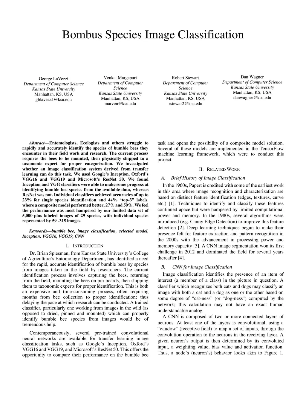 Entomologists, ecologists and others struggle to rapidly and accurately identify the species of bumble bees they encounter in their field work and research. The current process requires the bees to be mounted, then physically shipped to a taxonomic expert for proper categorization. We investigated whether an image classification system derived from transfer learning can do this task. We used Google Inception, Oxford VGG16 and VGG19 and Microsoft ResNet 50. We found Inception and VGG classifiers were able to make some progress at identifying bumble bee species from the available data, whereas ResNet was not. Individual classifiers achieved accuracies of up to 23% for single species identification and 44% top-3 labels, where a composite model performed better, 27% and 50%. We feel the performance was most hampered by our limited data set of 5,000-plus labeled images of 29 species, with individual species represented by 59 -315 images.