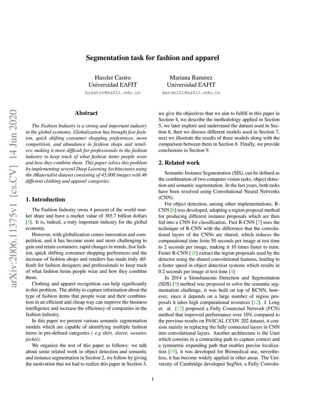 The Fashion Industry is a strong and important industry in the global economy. Globalization has brought fast fashion, quick shifting consumer shopping preferences, more competition, and abundance in fashion shops and retailers, making it more difficult for professionals in the fashion industry to keep track of what fashion items people wear and how they combine them. This paper solves this problem by implementing several Deep Learning Architectures using the iMaterialist dataset consisting of 45,000 images with 46 different clothing and apparel categories.