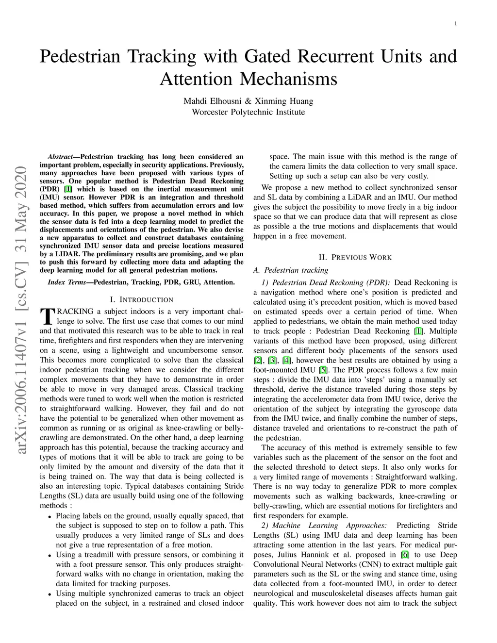 Pedestrian tracking has long been considered an important problem, especially in security applications. Previously,many approaches have been proposed with various types of sensors. One popular method is Pedestrian Dead Reckoning(PDR) [1] which is based on the inertial measurement unit(IMU) sensor. However PDR is an integration and threshold based method, which suffers from accumulation errors and low accuracy. In this paper, we propose a novel method in which the sensor data is fed into a deep learning model to predict the displacements and orientations of the pedestrian. We also devise a new apparatus to collect and construct databases containing synchronized IMU sensor data and precise locations measured by a LIDAR. The preliminary results are promising, and we plan to push this forward by collecting more data and adapting the deep learning model for all general pedestrian motions.